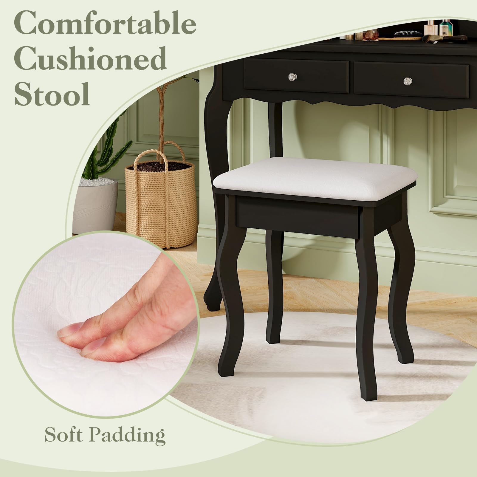 - [Luxurious Comfort]: Enjoy the plush comfort of our cushioned stool, which perfectly complements the vanity desk. It combines sophistication with comfort, making your makeup routine a relaxing and enjoyable experience.