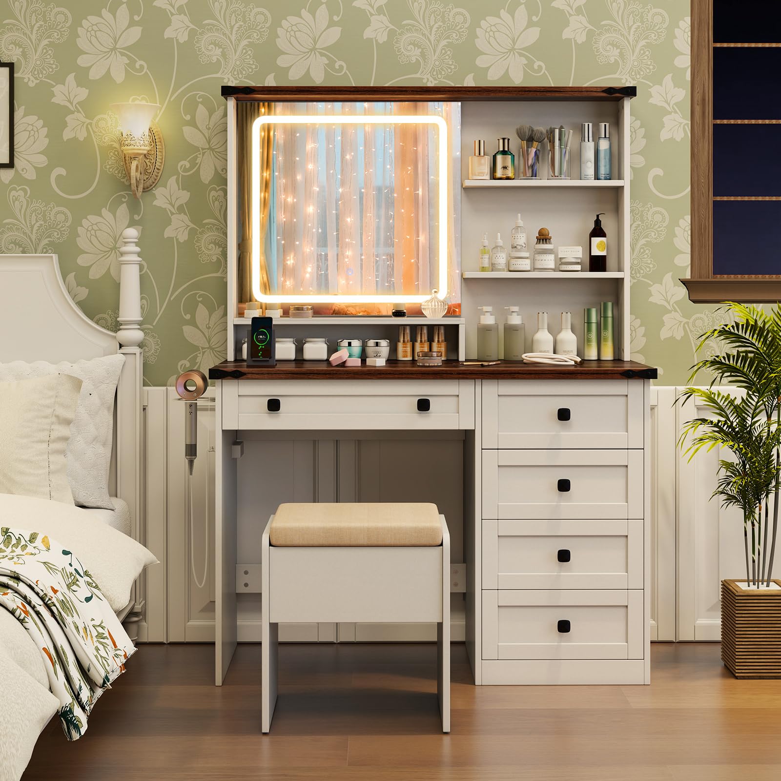 The vanity features a mirror with integrated lighting in three adjustable color modes, ensuring a clear view even in dim lighting. With a convenient touch switch, you can customize the brightness to suit your preferences. The included storage bench is designed for comfort, while the table provides ample storage options: 3 open shelves, a spacious desktop, and 5 drawers to organize your essentials. Hidden storage compartments offer additional space for smaller items. Plus, the built-in charging station with 2 AC outlets and 2 USB ports allows you to power your devices easily. For added stability and safety, the vanity set is equipped with widened legs, anti-slip foot pads, and an anti-toppling device.