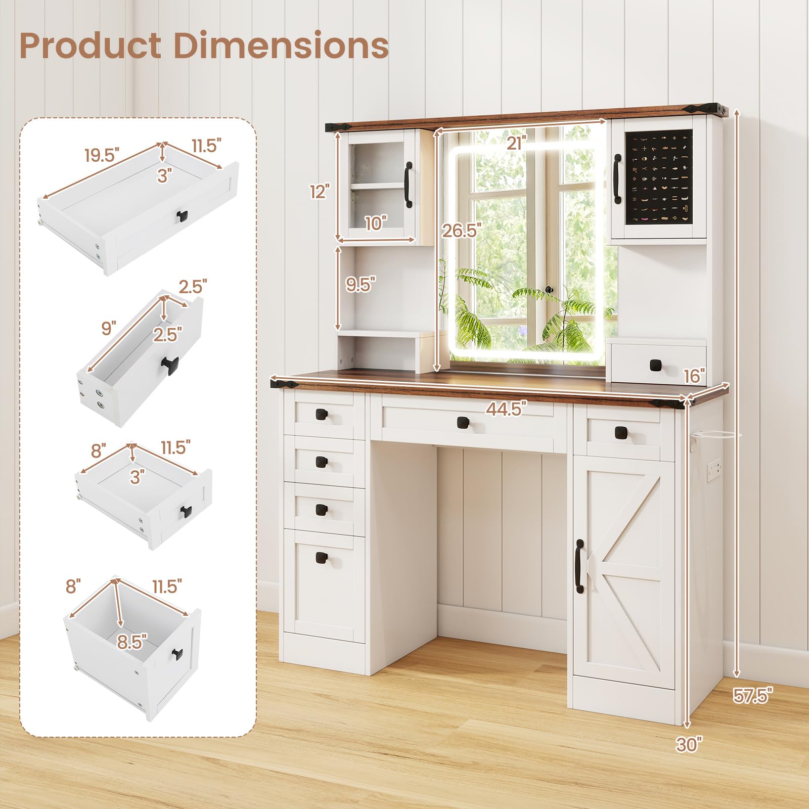The vanity table comes with a clear lighted mirror with 3 light colors and adjustable brightness, making your makeup time convenient and enjoyable. It also has 2 open shelves, 3 cabinets, and 7 drawers to hold your cosmetics, hair dryers, and beauty tools. The jewelry cabinet can accommodate 77 rings. You can also use the hair dryer rack to place your hair dryer. Additionally, there are 2 charging options: 2 AC outlets and 2 USB ports. The widened base and anti-toppling design ensure strong and sturdy stand.