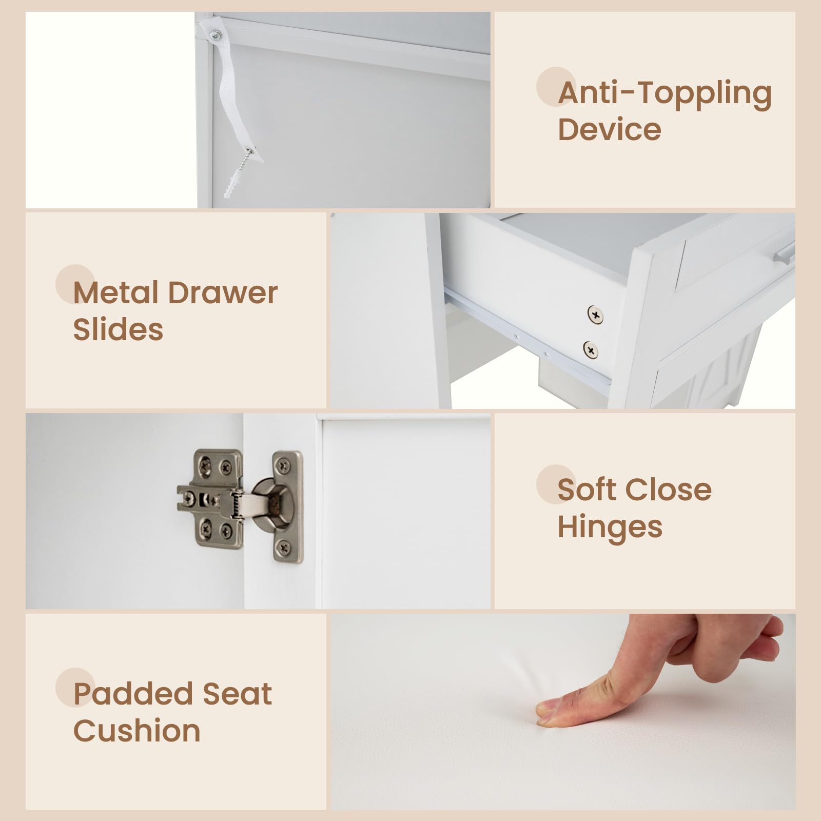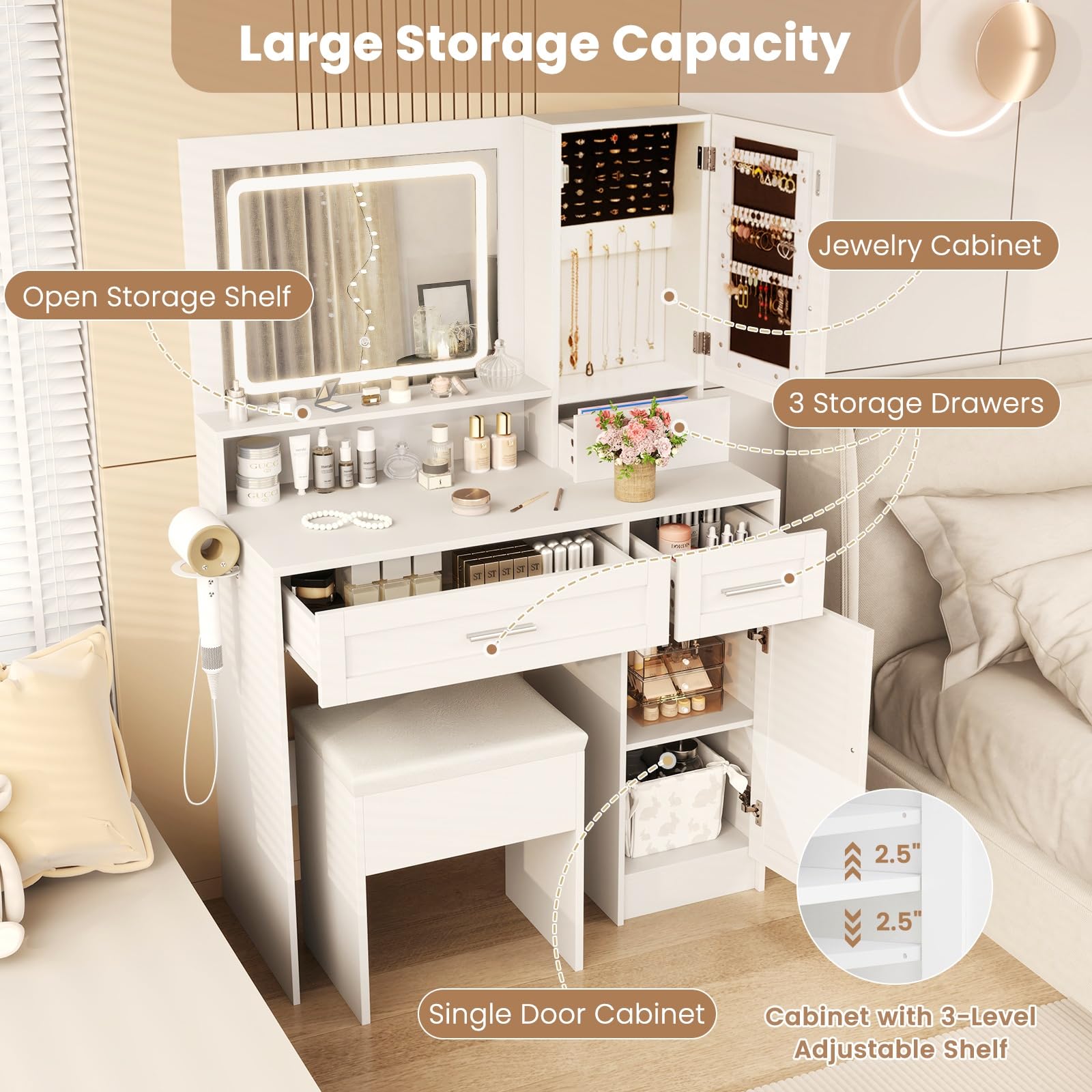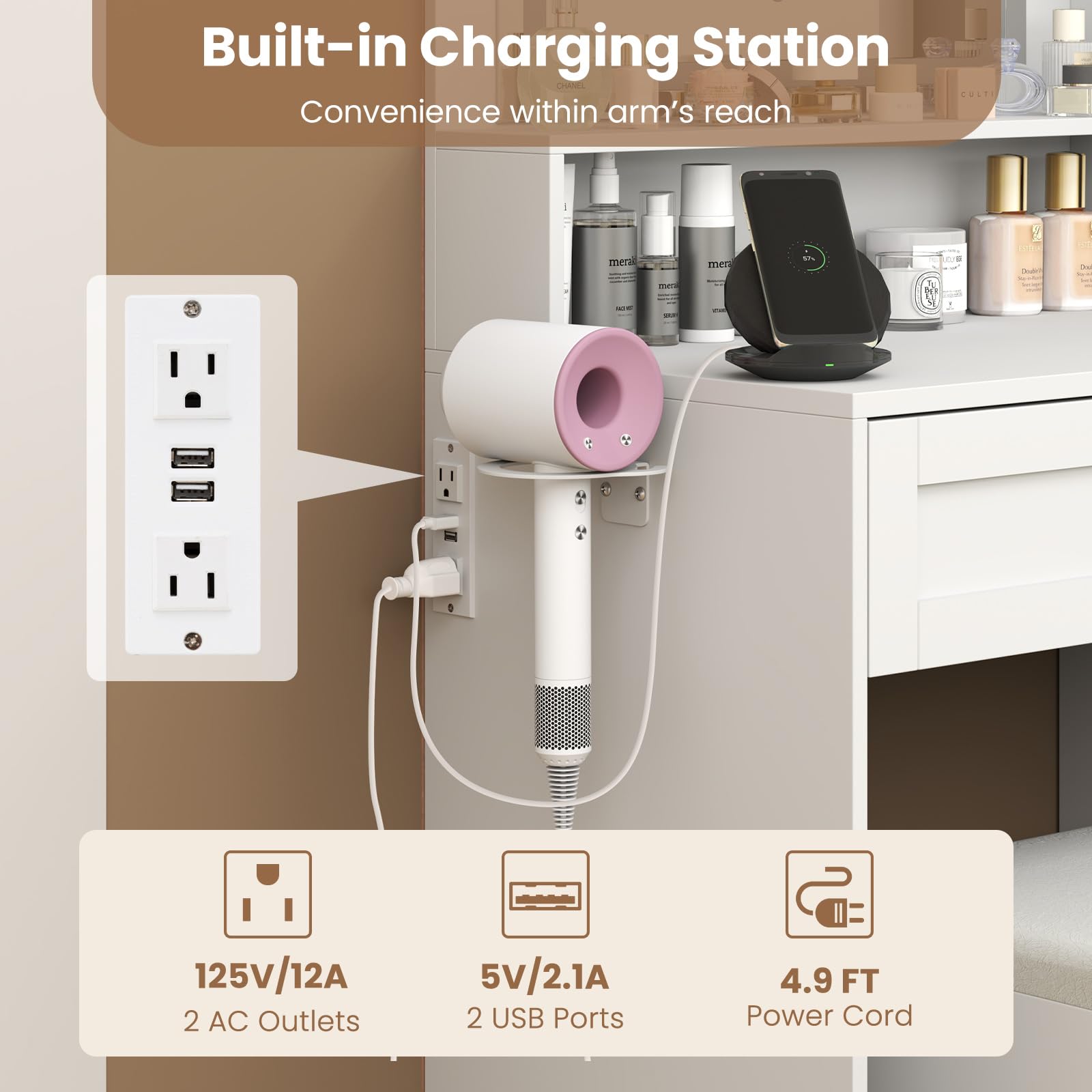 This makeup vanity table features a built-in charging station with 2 USB ports and 2 AC outlets for convenient device charging. The HD LED lighted mirror offers adjustable brightness and 3 color options to suit your needs. You can stay organized with ample storage including a jewelry cabinet, 3 drawers, an open shelf and more. This stylish and practical dressing table set makes a perfect gift for loved ones on special occasions, combining functionality and elegance beautifully.