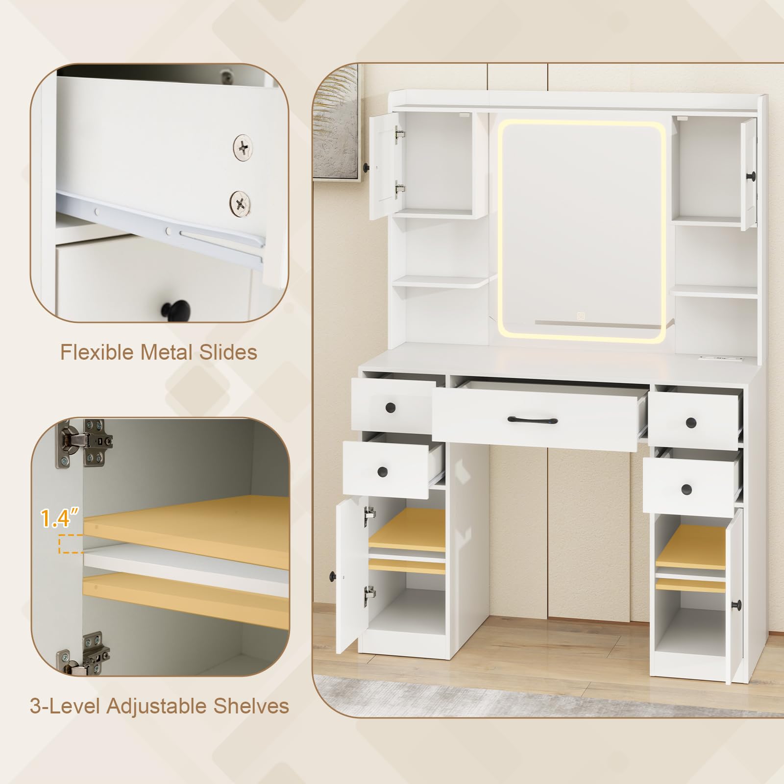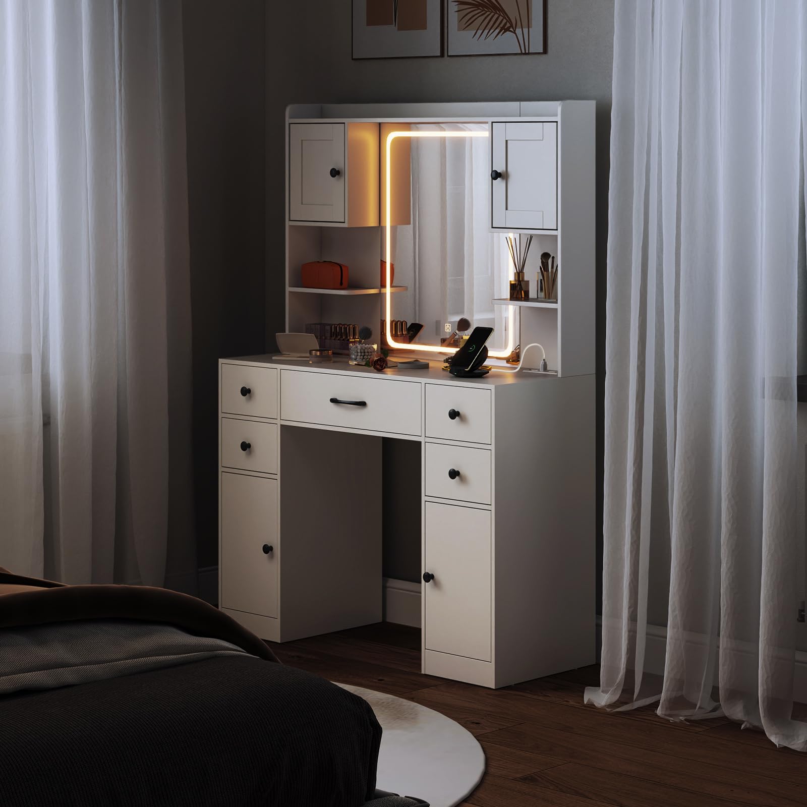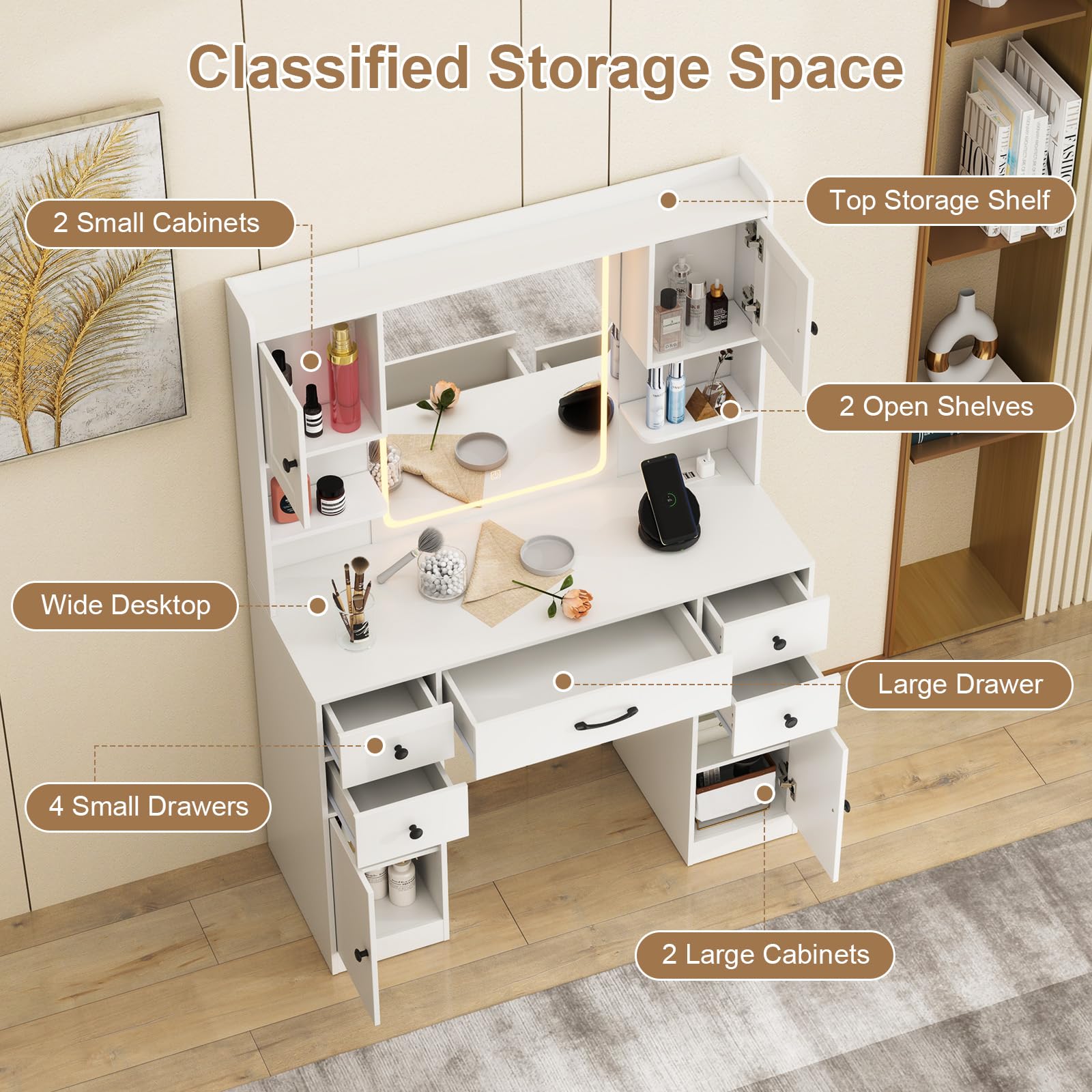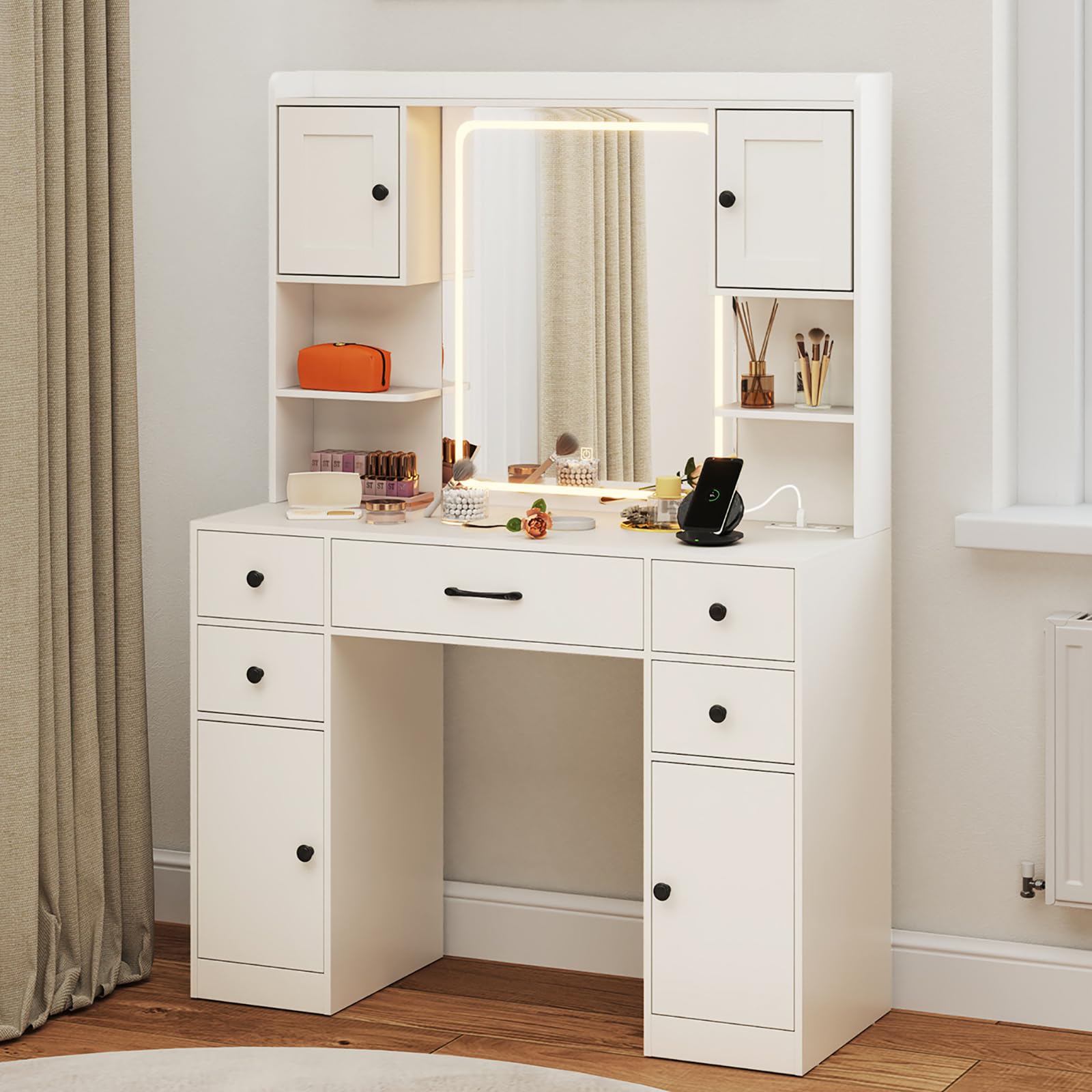 - [Spacious & Organized Storage]: Keep all your beauty essentials neatly organized with ample storage options, including 4 cabinets, 1 large drawer, 4 small drawers, and 3 open shelves. The 3-level adjustable shelves let you customize the interior to fit your items perfectly. The wide desktop also offers easy access to your daily must-haves.