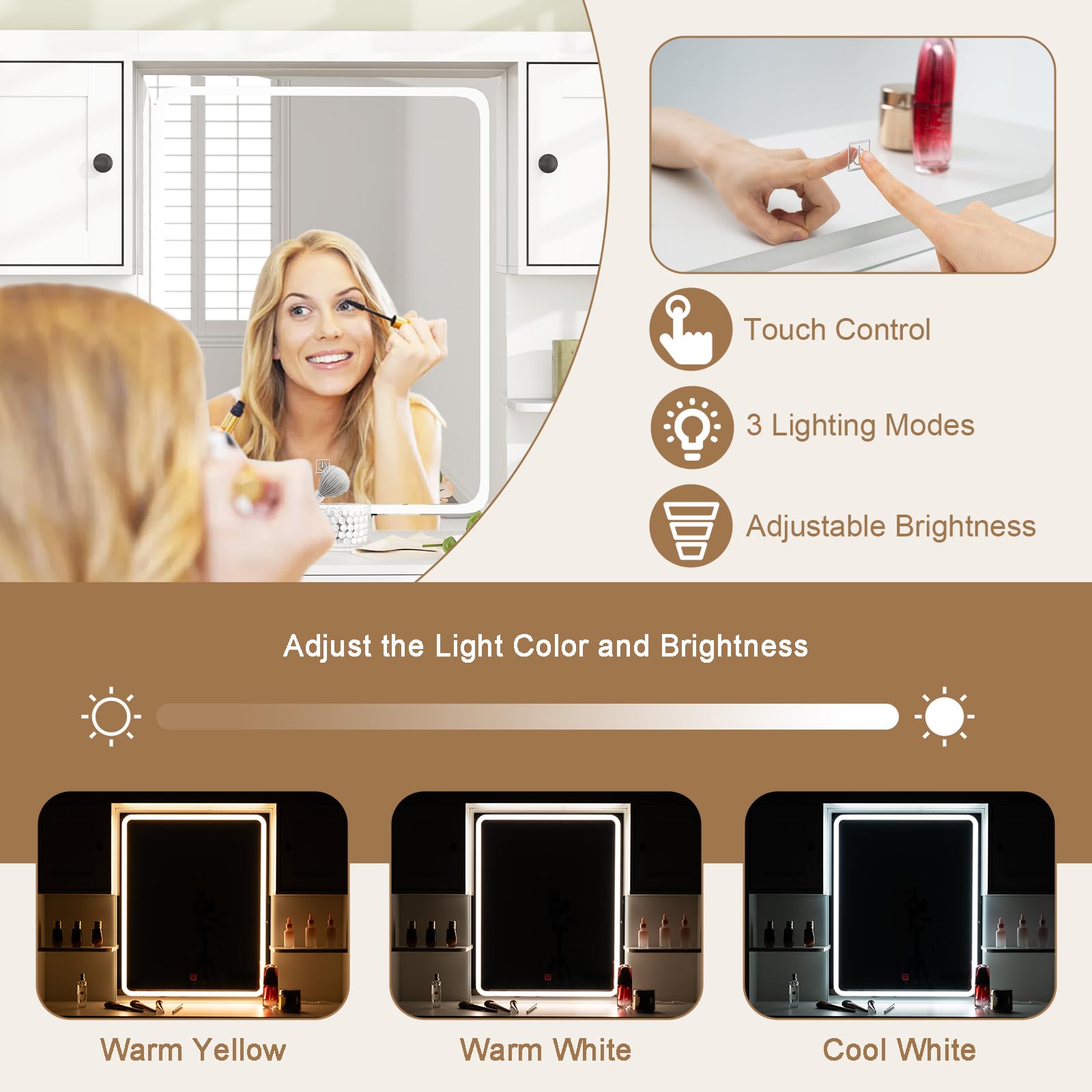 - [3-Color Lighted Makeup Mirror]: Elevate your beauty routine with a sleek vanity mirror featuring a built-in light strip and 3 adjustable lighting modes: warm yellow, warm white, and cool white. The intuitive touch controls allow you to effortlessly customize the light's color and brightness to suit your needs.