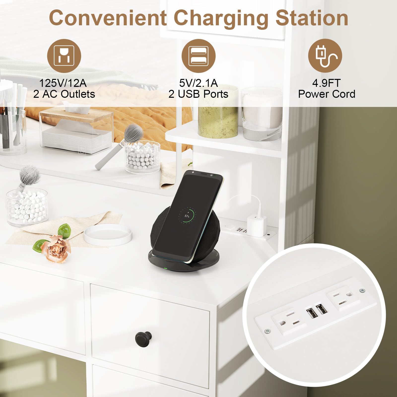 - [Convenient Charging Station]: Power up your devices and tools with ease! The integrated charging station features 2 AC outlets and 2 USB ports, perfect for charging phones, hair dryers, or other beauty gadgets. With a 4.9-ft power cord, it offers flexibility and convenience for your setup.