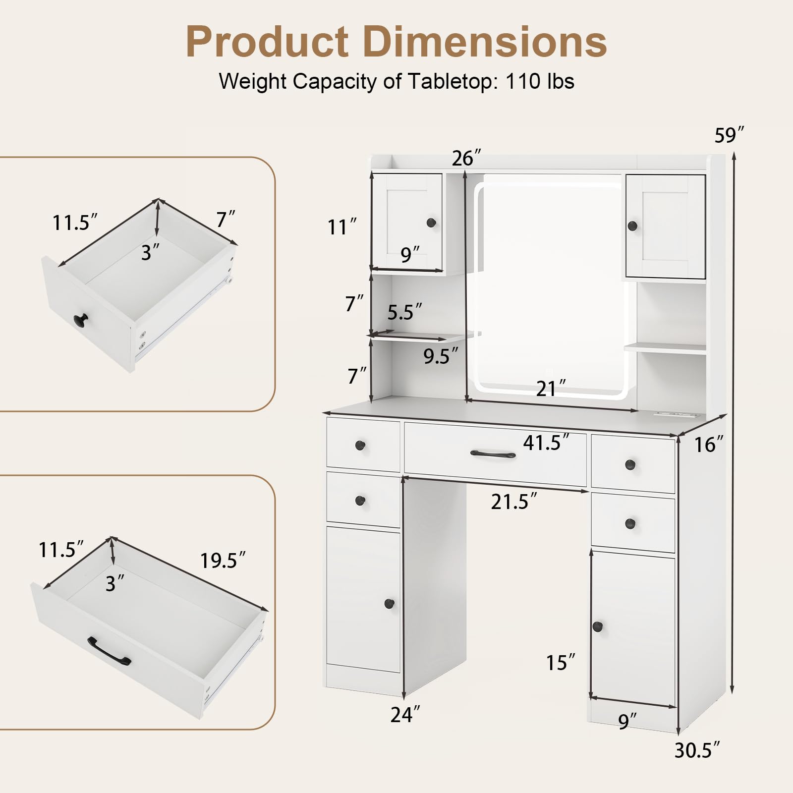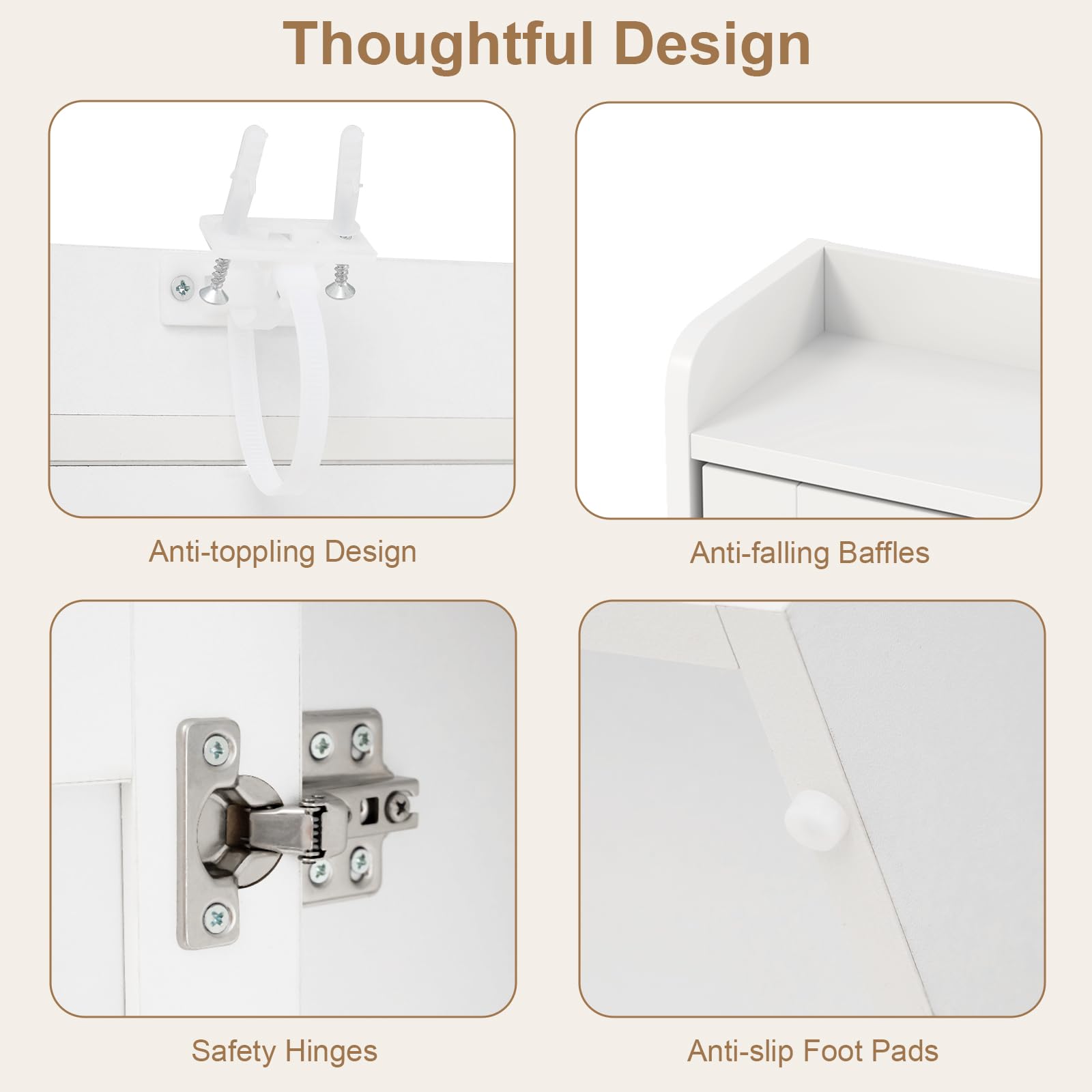- [Sturdy & Safe Design]: Built for durability, the widened base ensures excellent stability, while anti-slip foot pads protect your floors from scratches. For added safety, the anti-toppling design allows you to securely anchor the vanity table to the wall, giving you peace of mind.