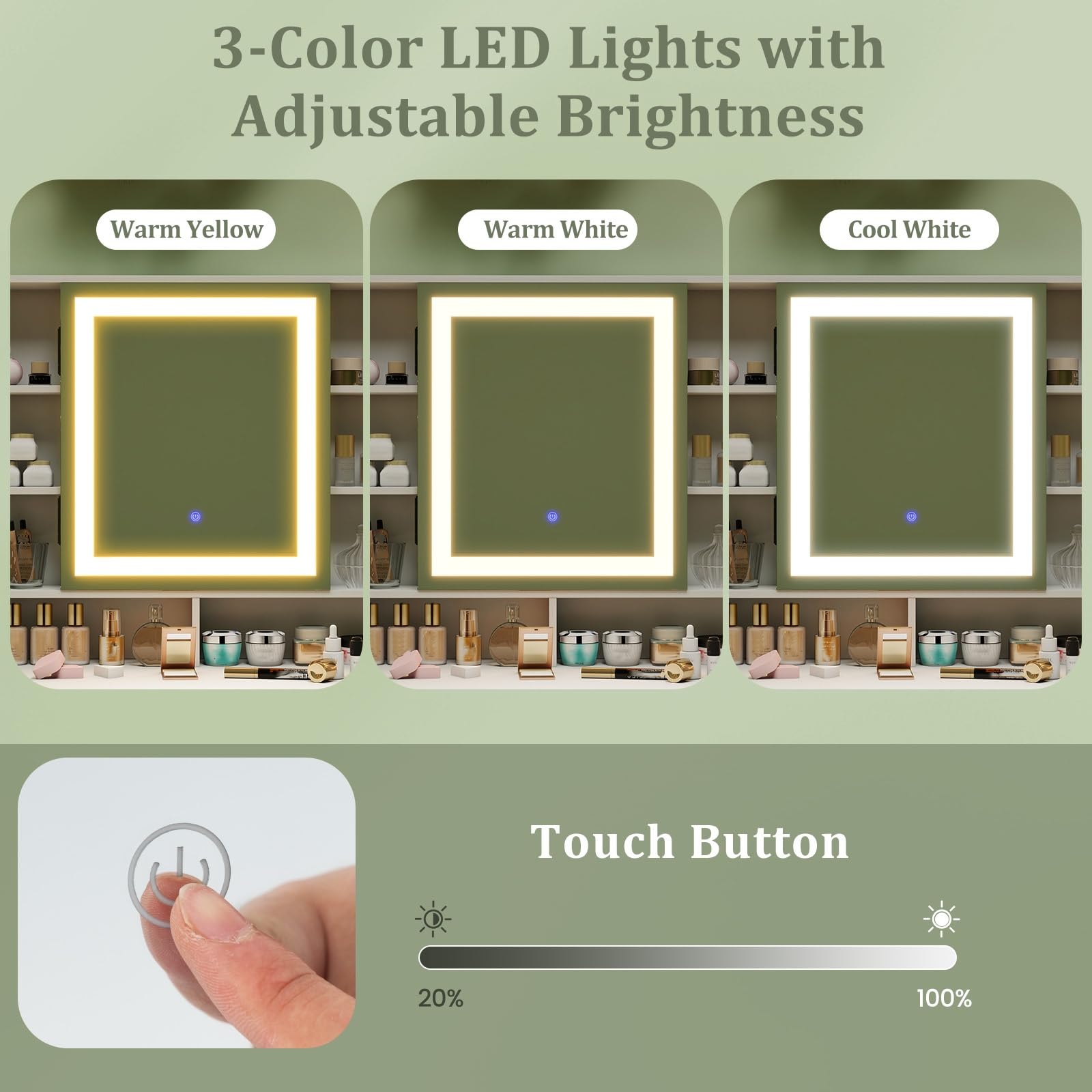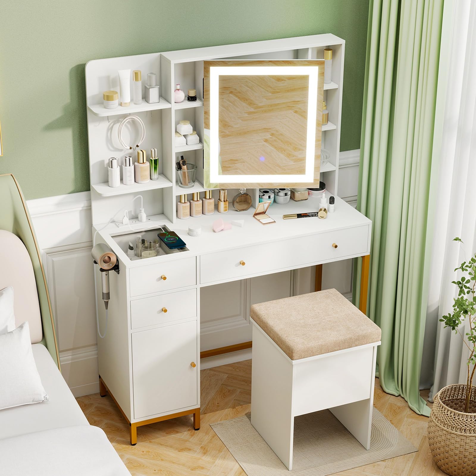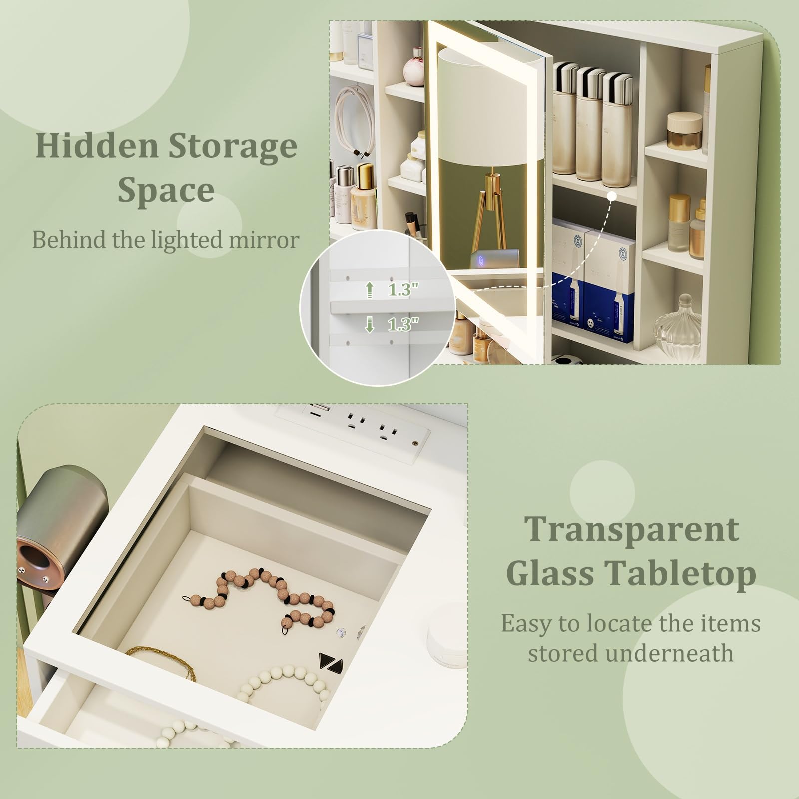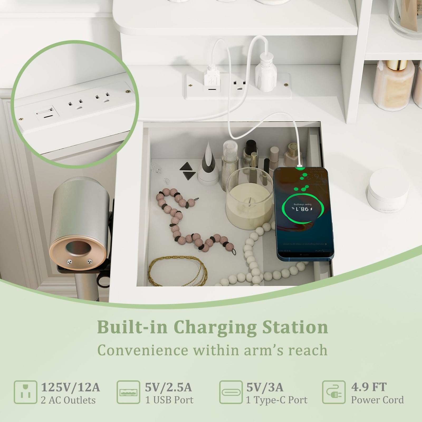This makeup table features a built-in charging station for convenient device charging. The HD LED lighted mirror offers adjustable brightness and 3 color options to suit your needs. You can stay organized with ample storage including a mirrored cabinet, drawers, multiple open shelves and more. This stylish and practical dressing table makes a perfect gift for loved ones on special occasions, combining functionality and elegance beautifully.