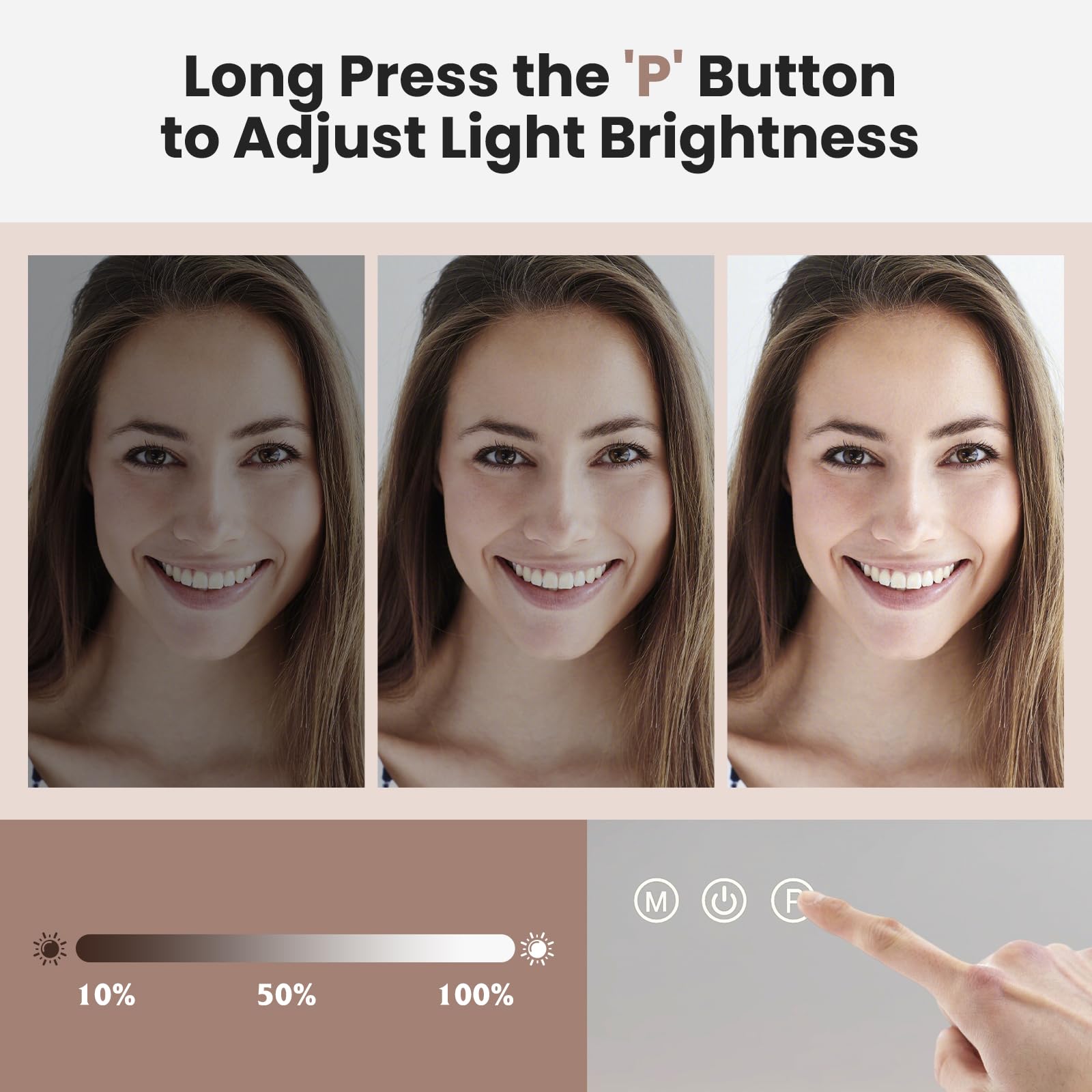 - Smart Touch Control: This Hollywood makeup mirror is designed with 3 intelligent touch keys for easy operation. You can touch the middle key to turn on/off the light, long press the 'P' button to adjust light brightness and just touch the 'M' button to switch the light color.