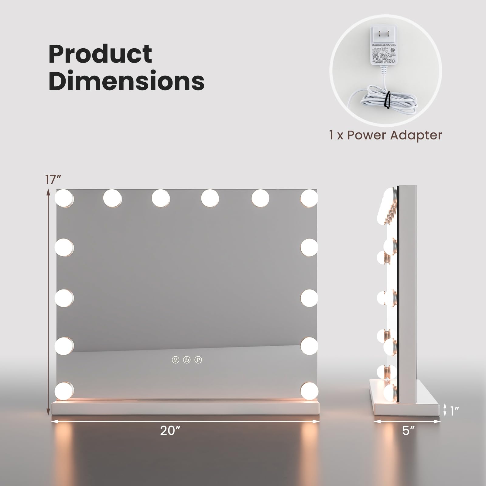 - Perfect Size & Stylish Design: This lighted vanity mirror measures 20" x 17", which is perfectly sized for tabletop use. Additionally, the elegant design of this Hollywood makeup mirror makes it a perfect addition to any bedroom, salon, makeup studio, etc.