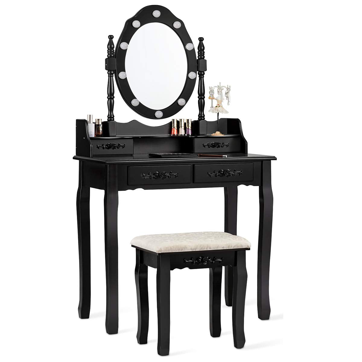 Designed with bright 10 bulbs, our vanity table enables you to do makeup in dark environment. You can also adjust the brightness according to your needs. There are several elegant and smooth lines around the mirror, and the rose shape knob makes this table look more elegant, simple and stylish, not exaggerated. Equipped with 4 drawers and combined with spacious tabletop, this makeup table provides enough space for you to store cosmetics, jewelries and other necessities.