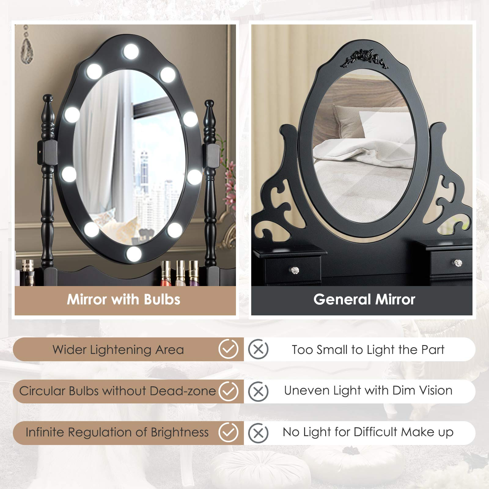 - Light up Your Beauty: The mirror of our vanity table is made of excellent material to ensure high definition and clear face. Serving as a makeup mirror, it can be rotated 360-degree to find the perfect angle for you. Surrounded by 10 bright LED bulbs, it helps you choose different brightness according to various scenes.