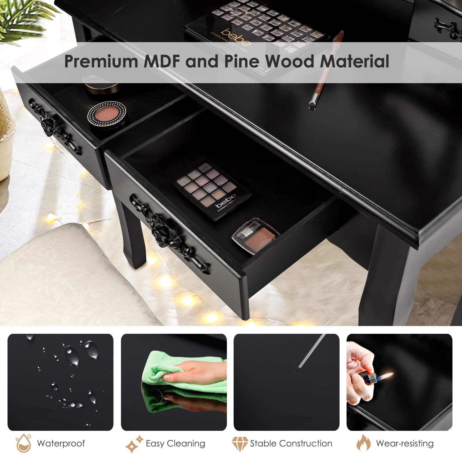 - All for Your Safety & Comfort: To increase the stability, this vanity table is constructed with thick MDF tabletop board, solid pine wood legs and anti-slip foot pads, bearing large weight and serving a long time. As for the comfort, the stool features soft cushion to reduce sedentary fatigue.