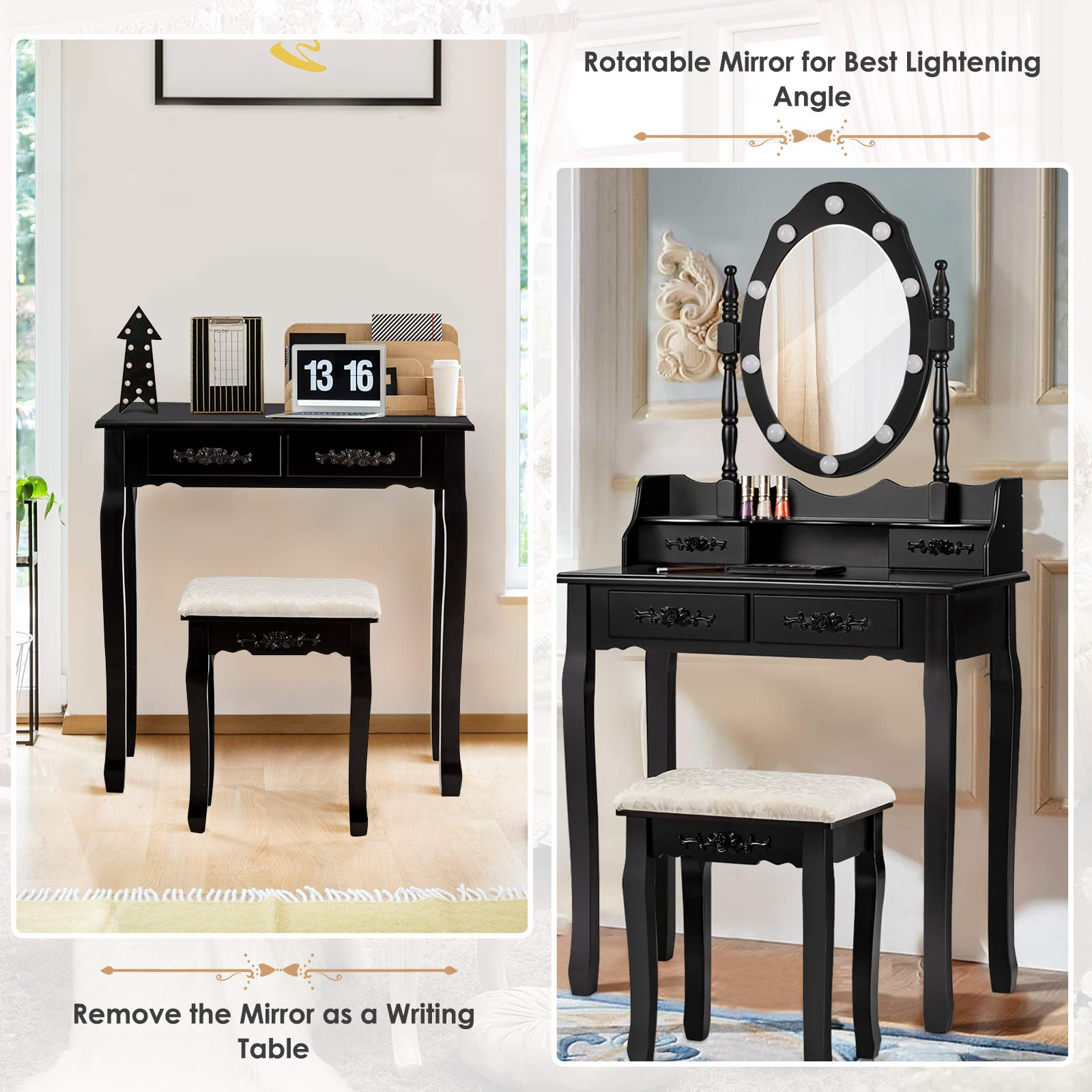 - Practical & Easy Use: As the top part of the mirror can be removed, this table set can not only be used as a dressing table for daily makeup, but also provides a place for writing or study. Due to its simple structure, the assembly can be quite easy, taking only a little time to complete.