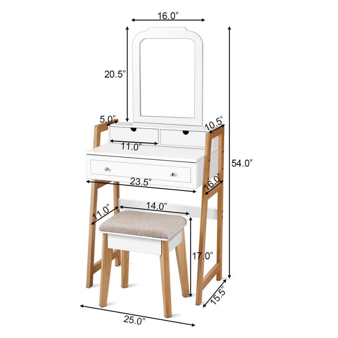 Our vanity set will never let you down with its charming appearance as well as practical functions. Constructed of thick density boards and pine wood legs, the whole set is sturdy to provide long time service. And there is a baffle between two legs to add stableness of the dresser. Equipped with one large drawer and two small drawers, there is plenty of space for you to store cosmetics and other items. And some daily accessories can be placed on 2-tier tabletop freely. Besides, there is also a pretty cushioned stool with thicker pad matching with the dresser so that you can sit comfortably when you are making up. Painted with smooth white coating, its elegant appearance will be a perfect decor for your home.