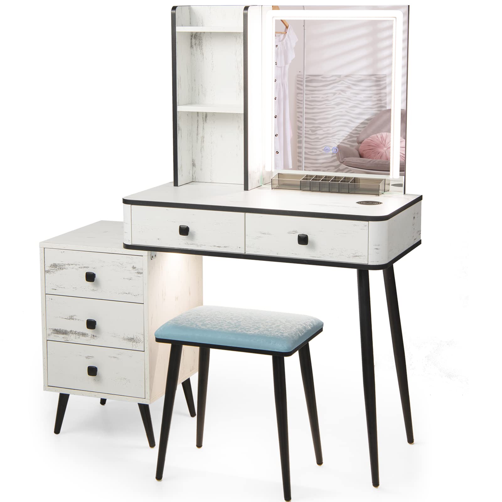 - Charging Station & Cushioned Stool Included: The makeup desk has wireless charging station with USB and Type-C ports designed to allow you to charge the mobile phone while making up. The padded stool is soft and comfortable, which offers you a comfortable makeup experience.