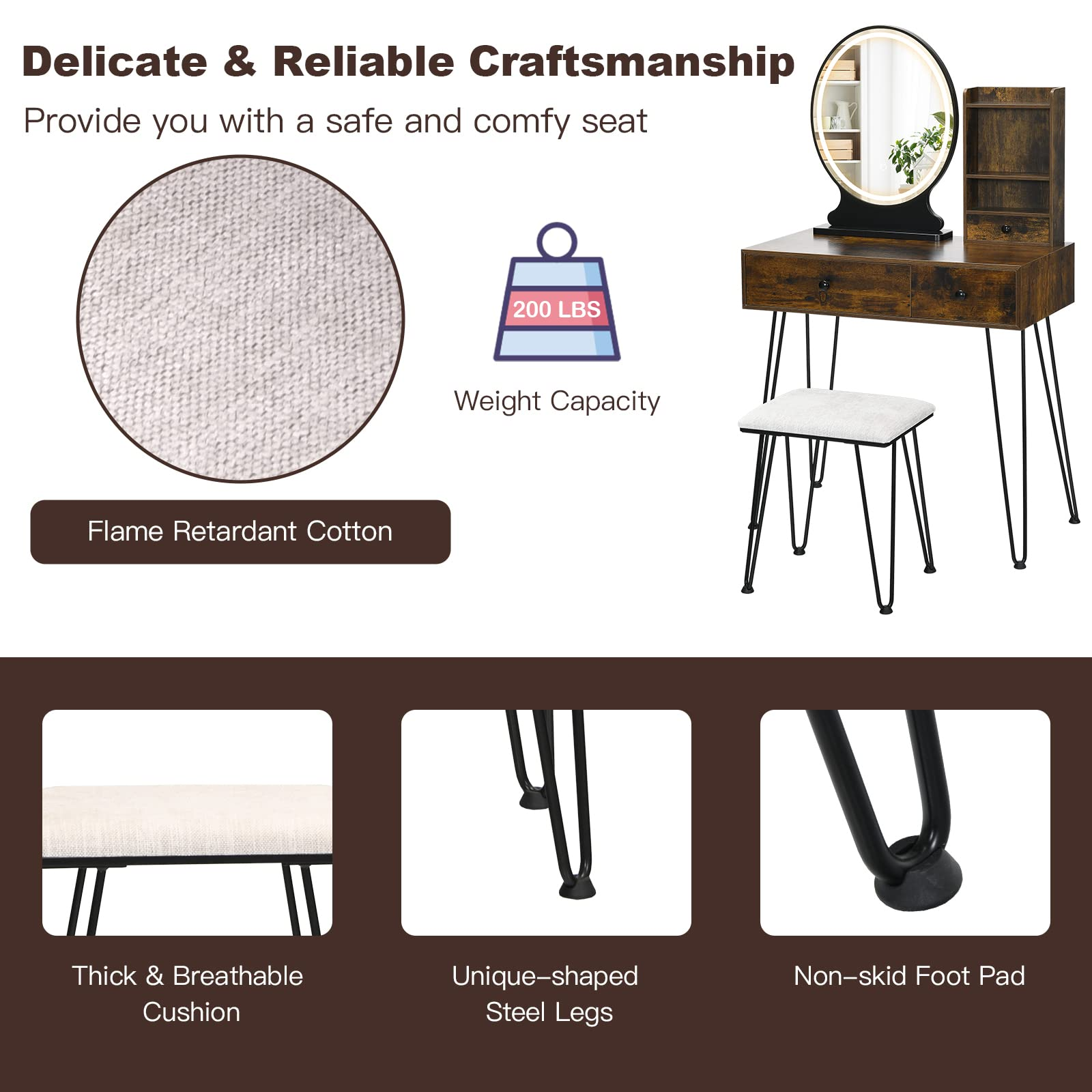 Get a good mood and begin your comfortable day with CHARMAID vanity table set! With three colors and adjustable brightness, you will feel comfortable and convenient to dress yourself under any conditions. A large tabletop, an exquisite table shelf and two large drawers, one of which has jewelry organizers, provide you with more storage space. If you are looking for such a wonderful vanity set, please don't miss it and bring it home right away!