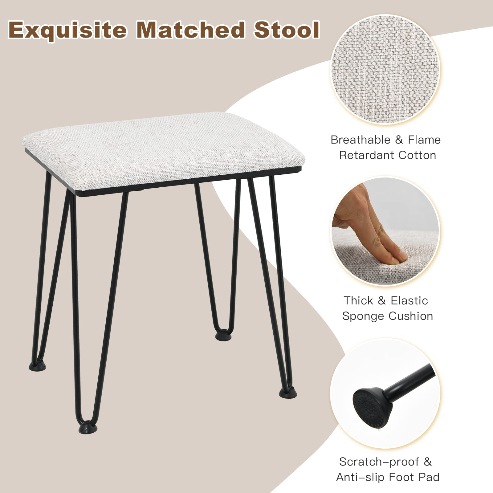 - Sturdy Wooden Tabletop and Steel Legs: With a wooden tabletop and steel legs, this vanity set is very sturdy and durable. The extra soft cushioned stool allows you to sit comfortably when makeup and it can hold up to 220 pounds. The anti-slip round mat on the bottom of the legs can prevent scratching your floor.
