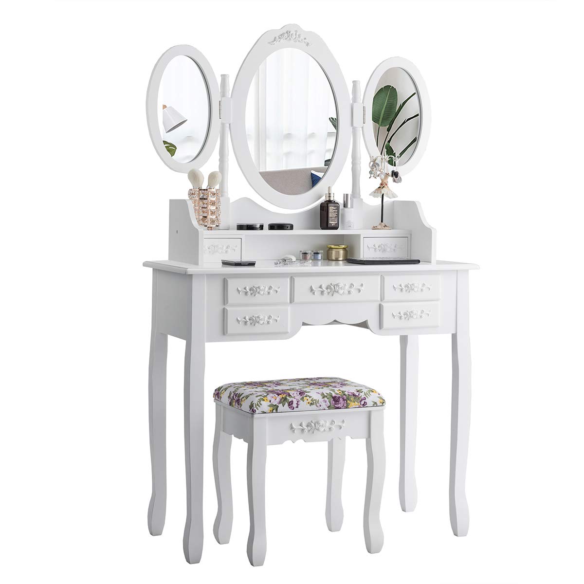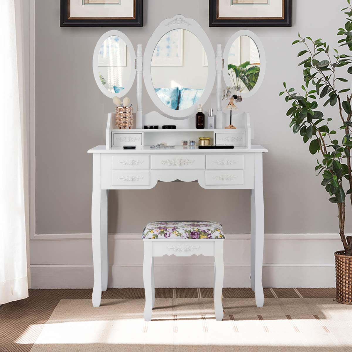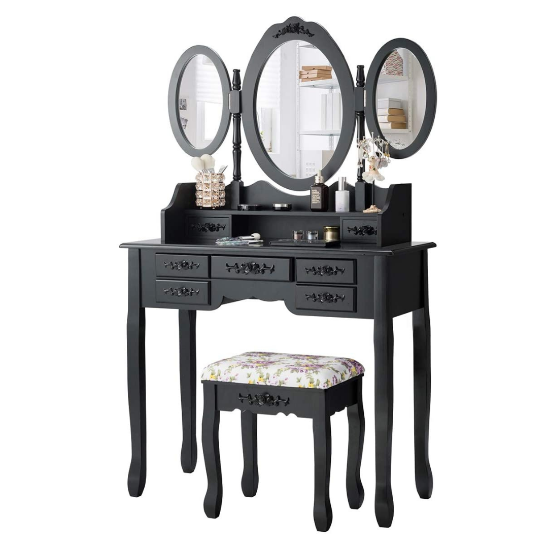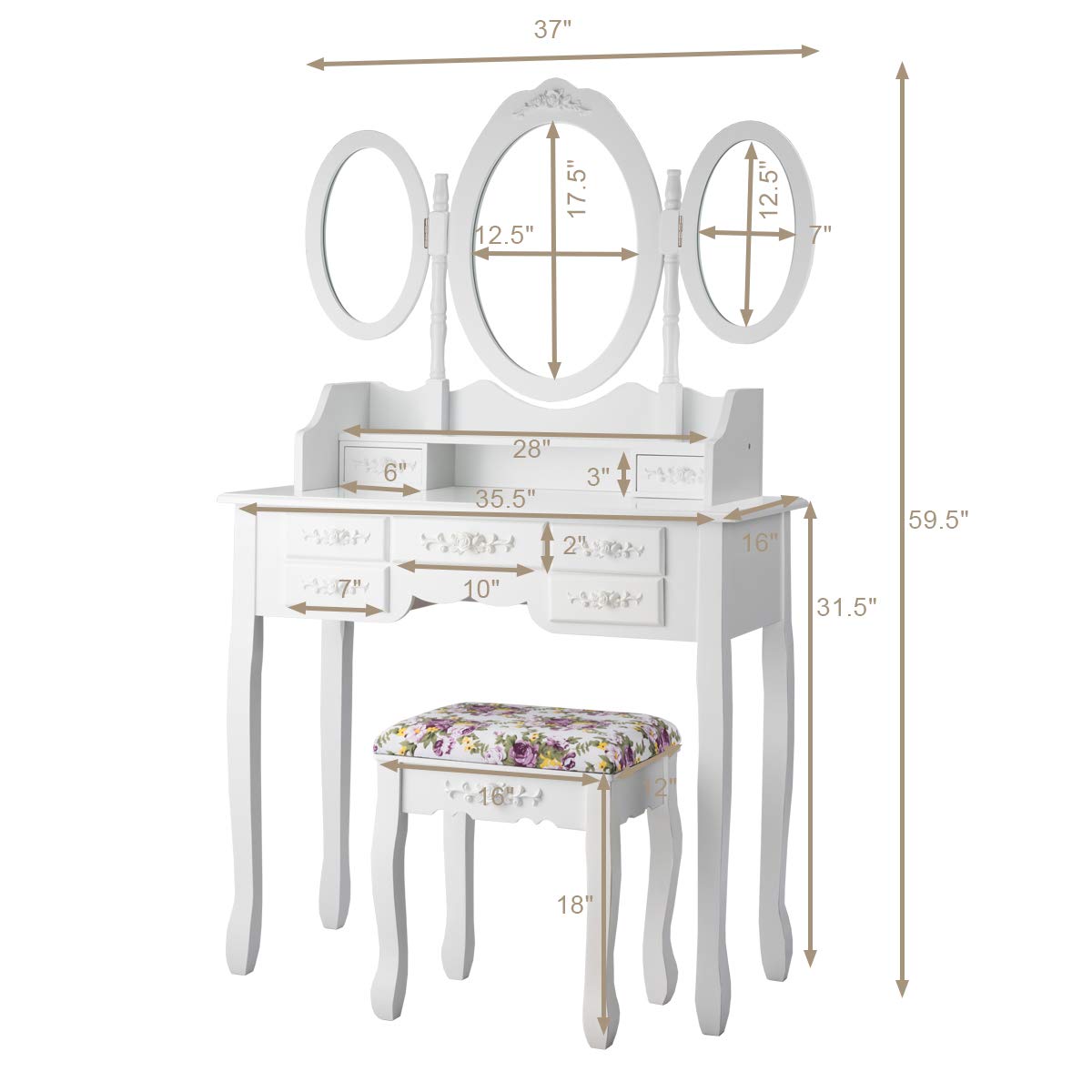 An elegant and practical vanity set can help you to put on beautiful make-up. Our vanity set will never let you down with a charming appearance as well as its powerful practicality. Made of thick density board and solid wood, this dressing furniture set is sturdy and durable enough to serve you long time. There are 3 mirrors that can be folded or rotated to get better light when you are making up. Featuring 7 drawers with exquisite knobs, you can store your jewelry and ornaments in order. And the spacious tabletop also has enough space for storing your Cosmetic and makeup tools. Designed in an elegant and gorgeous style, the whole set will be a perfect decor for your home. Give yourself or your loved one this vanity set as a considerate gift.