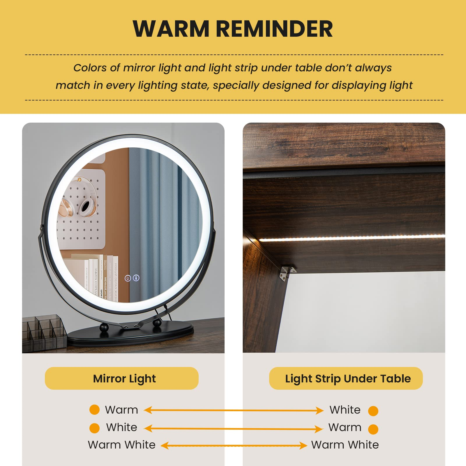 SPECIAL LIGHTING DESIGN: The colors of the mirror light and light strip under the table do not always match in every lighting mode. The WARM mirror light matches with the WHITE light strip under the table. The WHITE mirror light matches the WARM light strip under the table. Make sure you don't mind with this special lighting design.