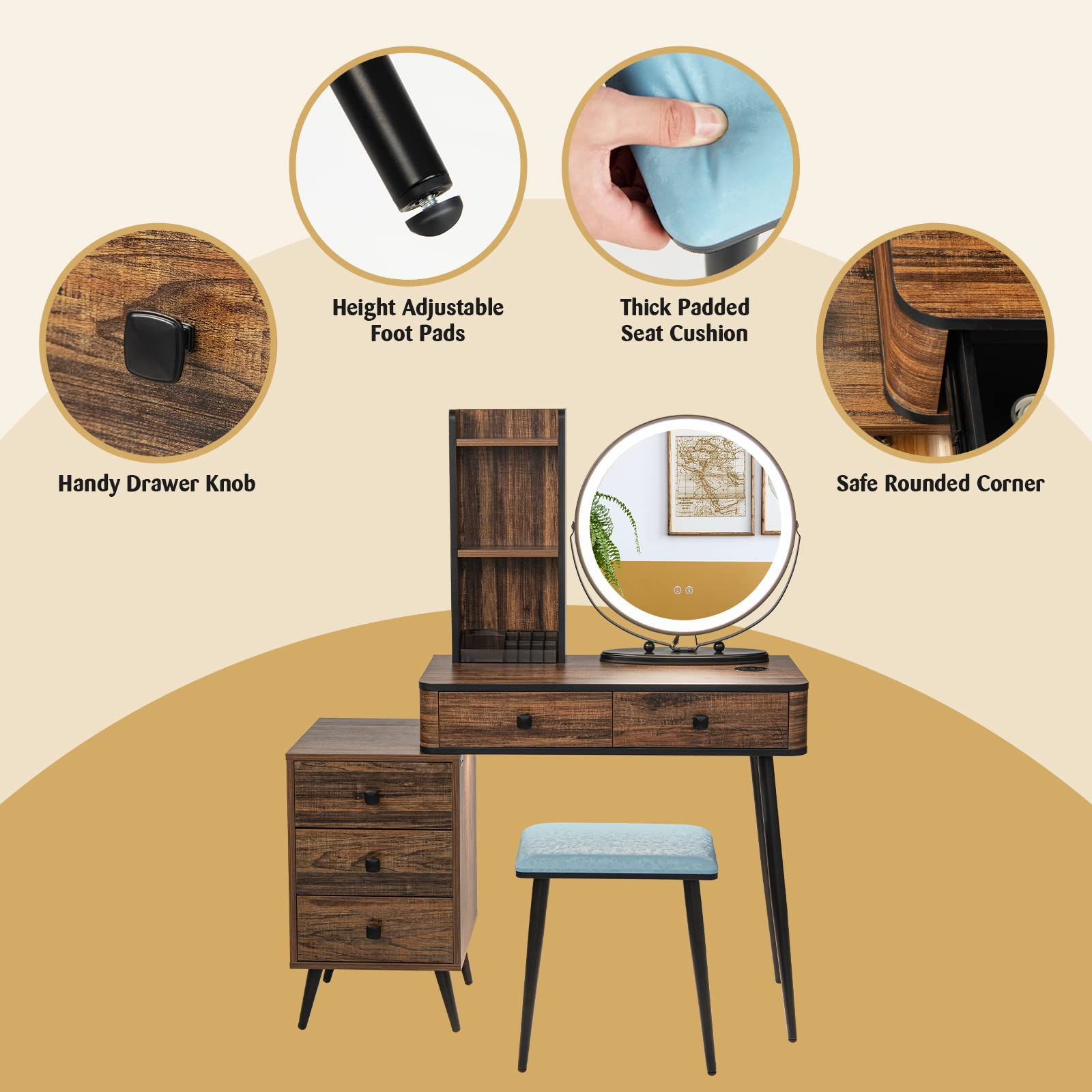 The LED lights on the mirror and under the table feature 3 color temperatures and 5%-100% brightness to satisfy your various light requirements. And the memory function and human body induction function bring more convenience to your daily life. Built with drawers, storage shelves, and cosmetic trays, you can well organize jewelry, cosmetics, skincare products, etc. The steel frame and high-quality MDF are durable for long-term use. The vanity set also comes with a cushioned stool.