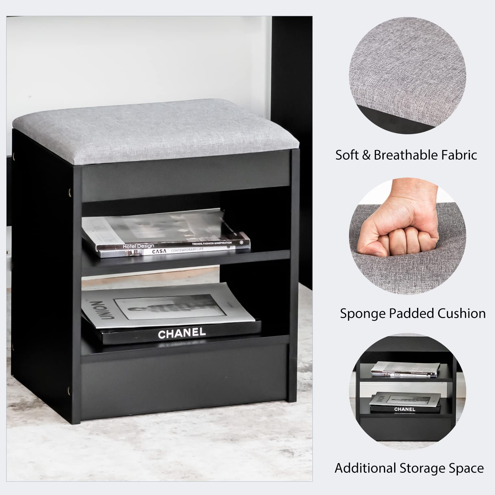 - Cushioned Stool with Shelf: Our vanity set comes with a stool, which is equipped with a sponge padded seat, which is soft and comfy to bring you better sitting experience. Beneath it is additional storage space to let you keep some items within reach.