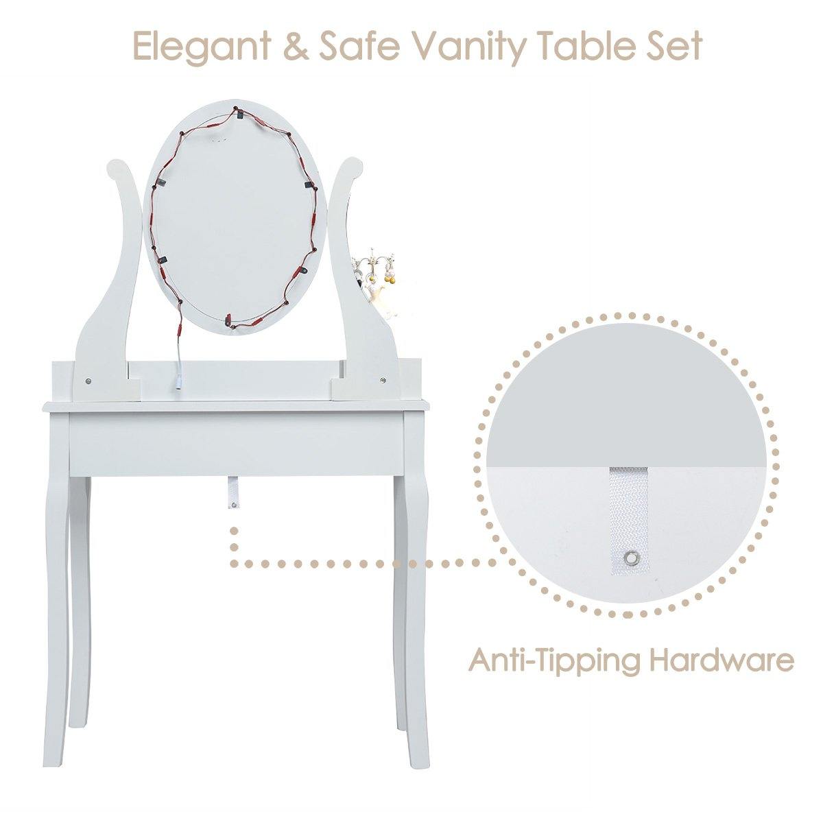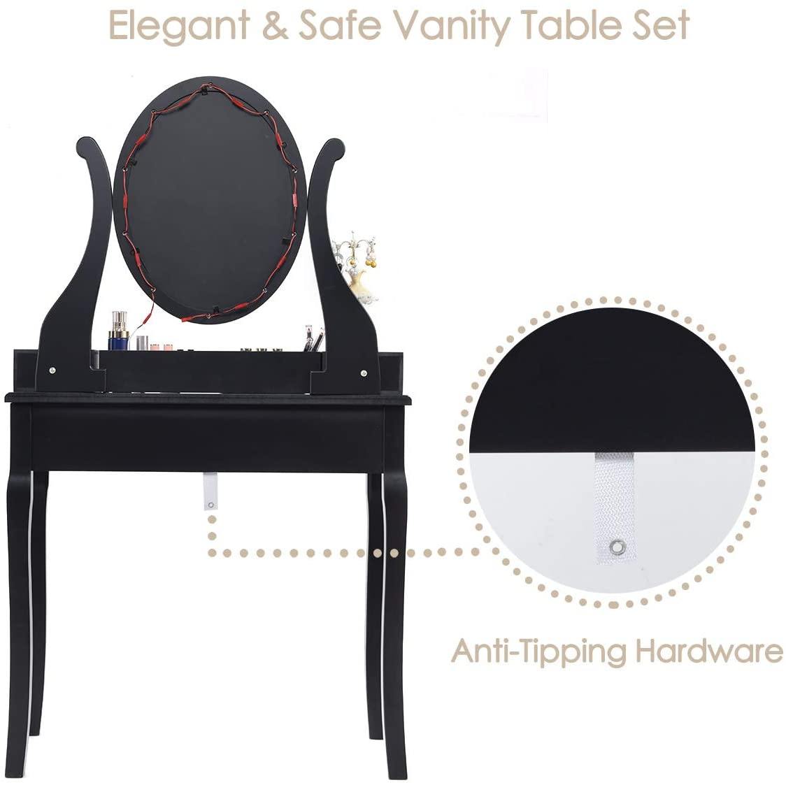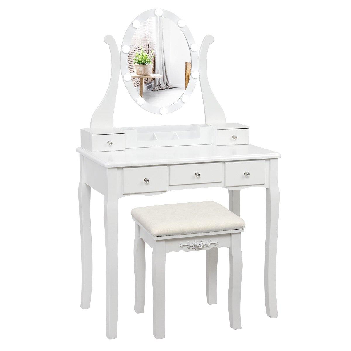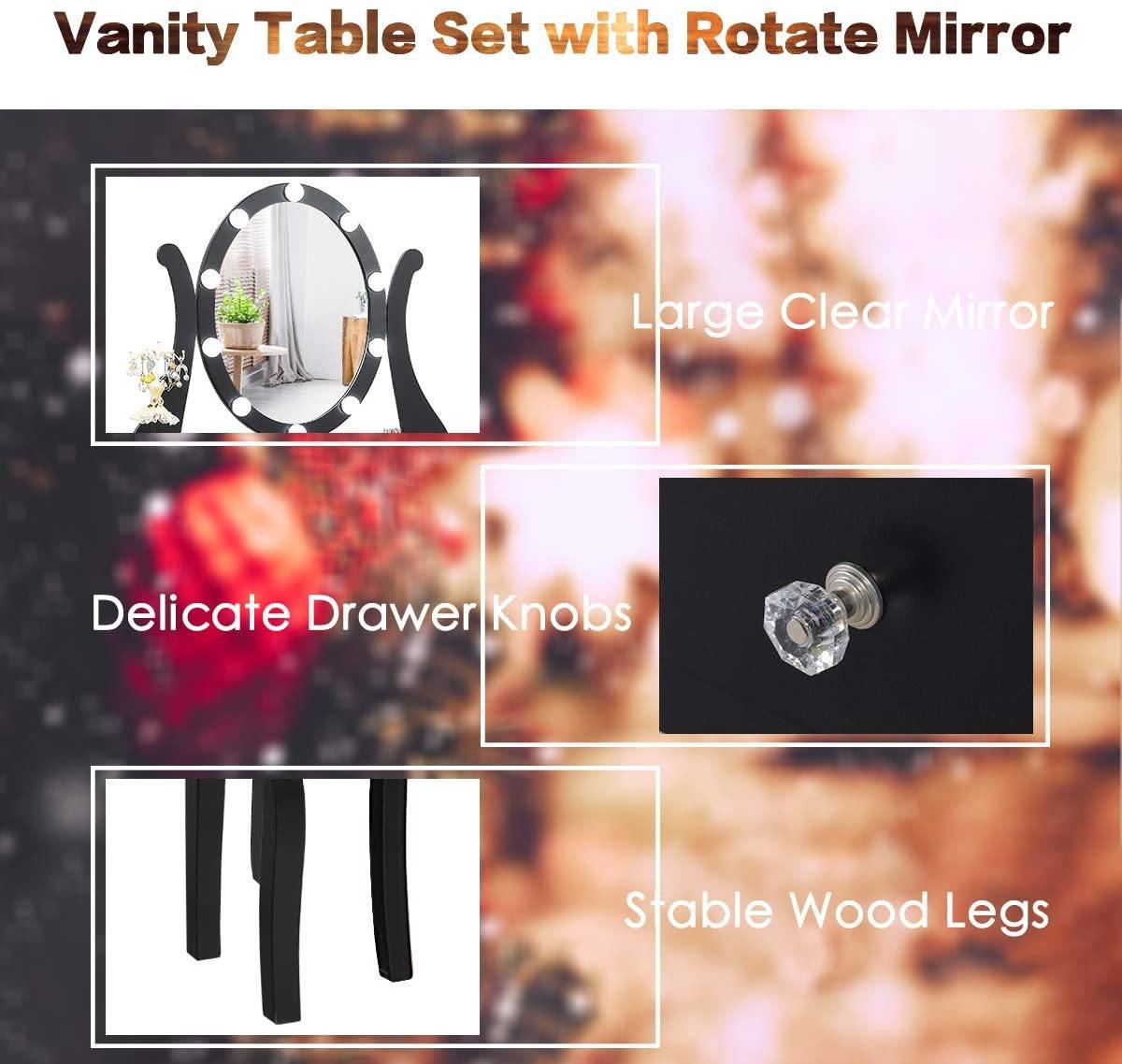 Our vanity set is made of premium MDF and solid wood legs and offers excellent durability and stability. 10 LED bulbs on the mirror can adjust the brightness and have a memory function, which can be easily turned on or off by touching the switch. The oval 360-degree rotating mirror can change the appropriate angle according to your own needs, giving you a more clear makeup experience. A spacious desktop and 5 drawers provide you with enough storage space for cosmetics and jewelry to keep your room tidy. You can switch between a laptop desk and a dresser, which is perfect for limited space.