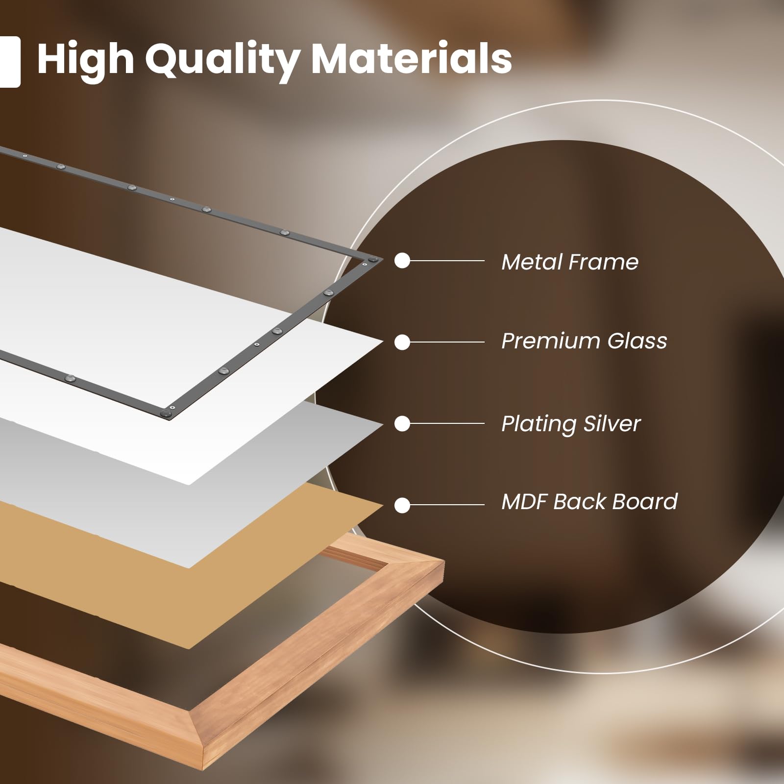 - High Quality Materials: This wall mirror is made of high-quality materials, including a metal frame, premium glass, silver plating, and an MDF backboard. The mirror is firmly framed with thick and durable fir wood, ensuring stability and preventing cracks.