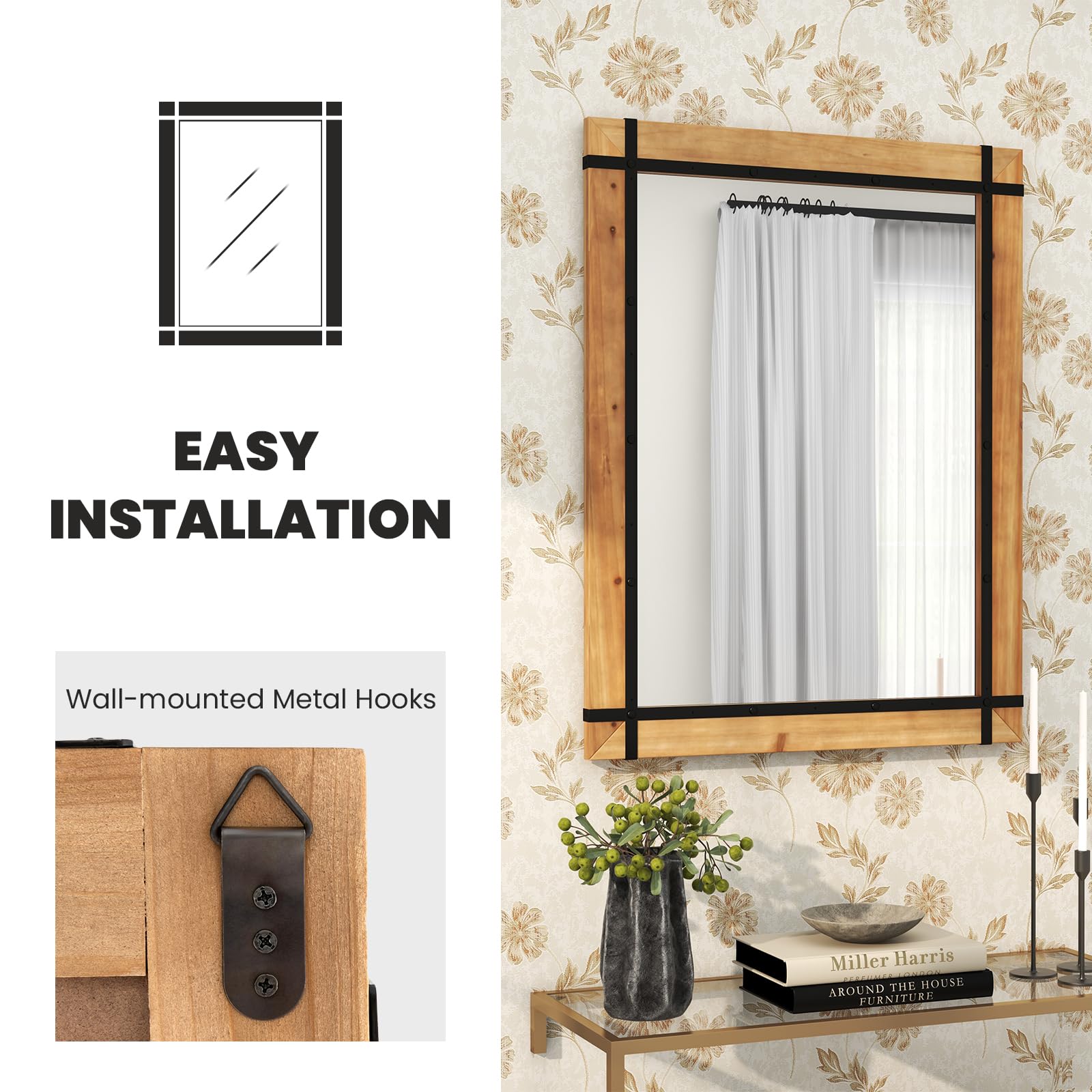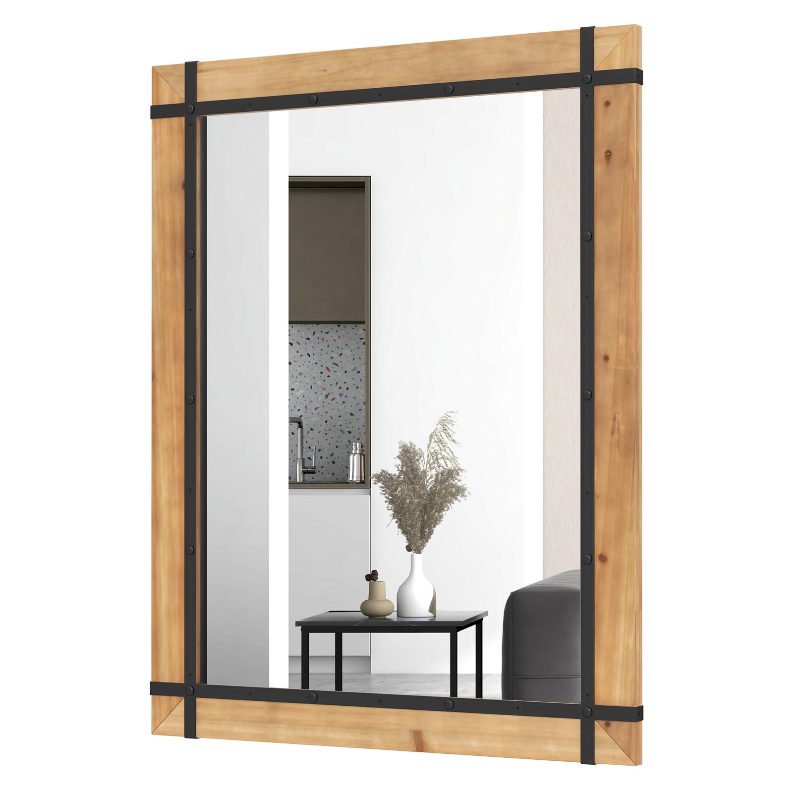 Get an elegant and stylish touch for your home decor with our rectangular wall mirror. The mirror's classic design features reflective glass panels that beautifully enhance light. With a solid fir wood frame, it offers stability and durability. The frame not only adds elegance but also protects the mirror. The explosion-proof glass ensures clear imaging and safety. Perfect for decorating walls and creating a spacious and illuminated atmosphere. It's easy to hang vertically with secure metal hooks attached at the back.
