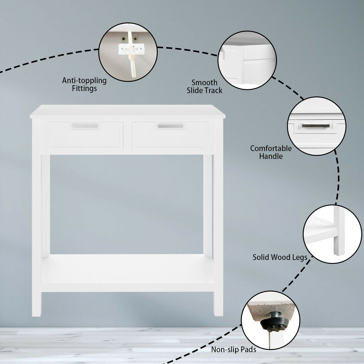 Made of Premium MDF and 100% solid wood legs, our console table has a durable and stable structure to ensure long service life. Two spacious drawers allow you to place various private small items such as cosmetics, sewing boxes, etc. The high load-bearing tabletop and bottom shelf also provide ample display space for your decorations. 4 adjustable non-slip pads and anti-toppling fitting allow you to use more stable and safe. In addition to being used as a sofa table for living room, entryway and hallway, it can also be used as a dressing table for bedroom. Simple and modern appearance can be integrated with any surrounding environment.