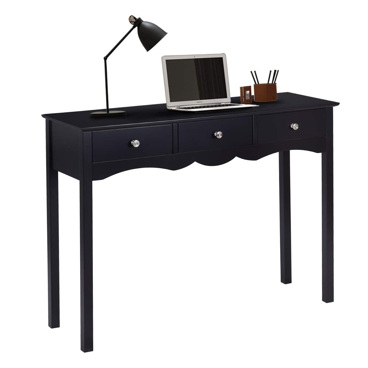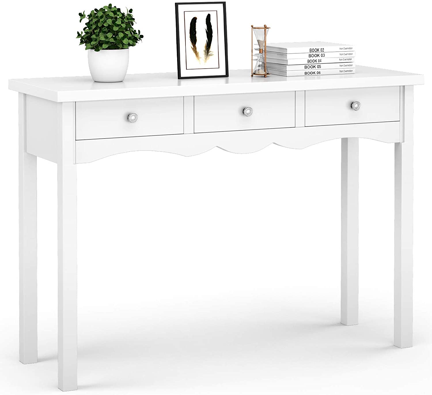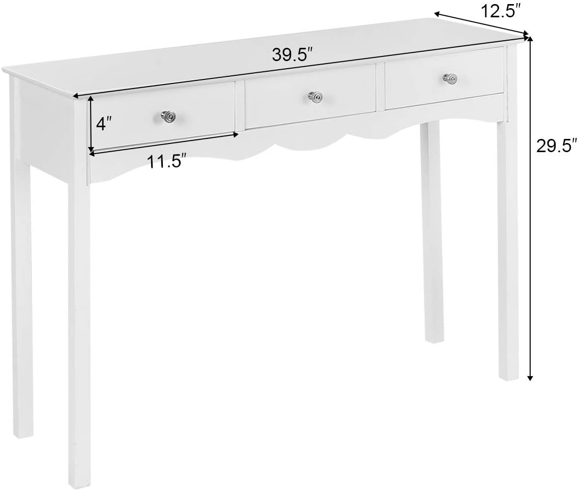 Our Giantex 3-drawer attractive and multifunctional console table adds style andcharm to your home. It is characterized by three drawers with full extensionand easy access to contents inside. Our sofa console table is built to lastwith sturdy and durable construction as well as high-quality black and whitefinish. Quick and knock-down installation and detailed manual ensure thatsetting up is easy. This table is a nice scale for entryways and behind sofaswith its suitable size. Square tabletop is equipped with sleek and flat surfacewhere you can put many stuffs you like. Three drawers are easily opened andclosed as well as deep enough for storage. It will be worthy of your purchase!
