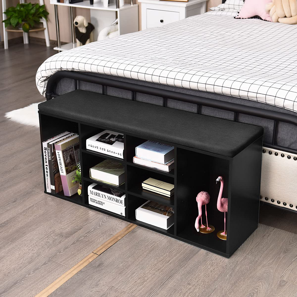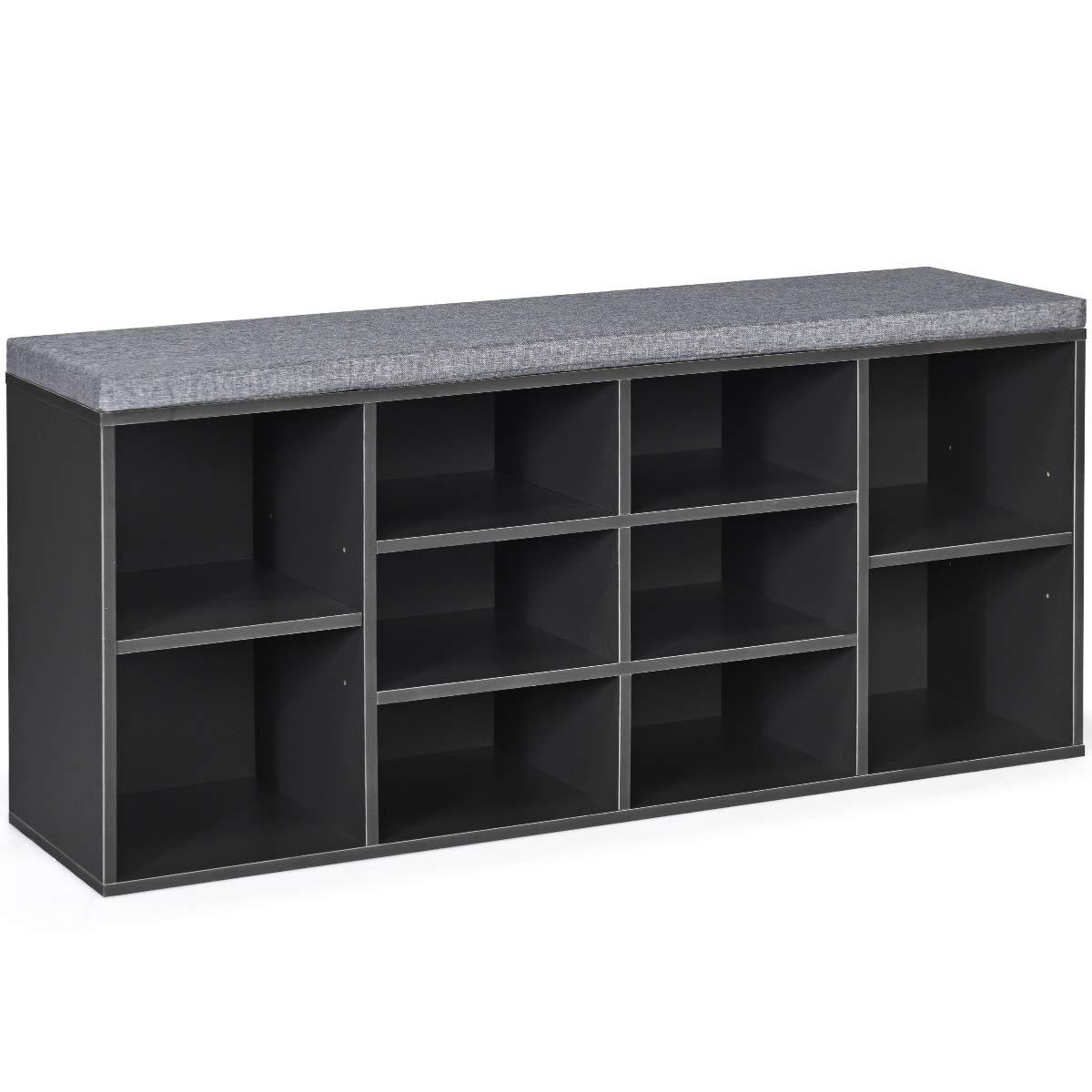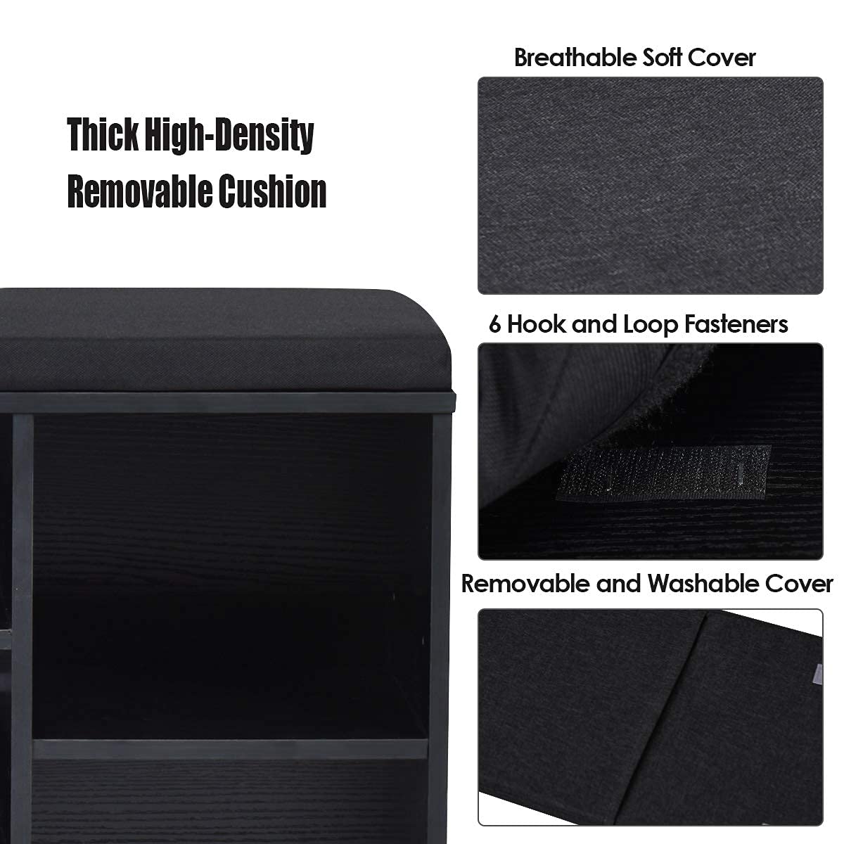 - Stable and Rugged Structure: This shoe storage bench is sturdy while featuring max 440lbs strong load-bearing. Additionally, the seat cushion is fixed on the bench by 6 hook and loop fasteners to ensure that it is not easy to slide.