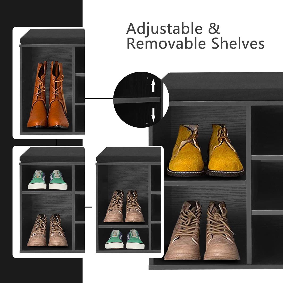 - Flexible & Ample Storage Space: The height of the middle shelves on both sides can be adjusted in 3 heights to fit high heels or boots. 6 cubes in the middle of the shoe bench storage your all types of shoes.