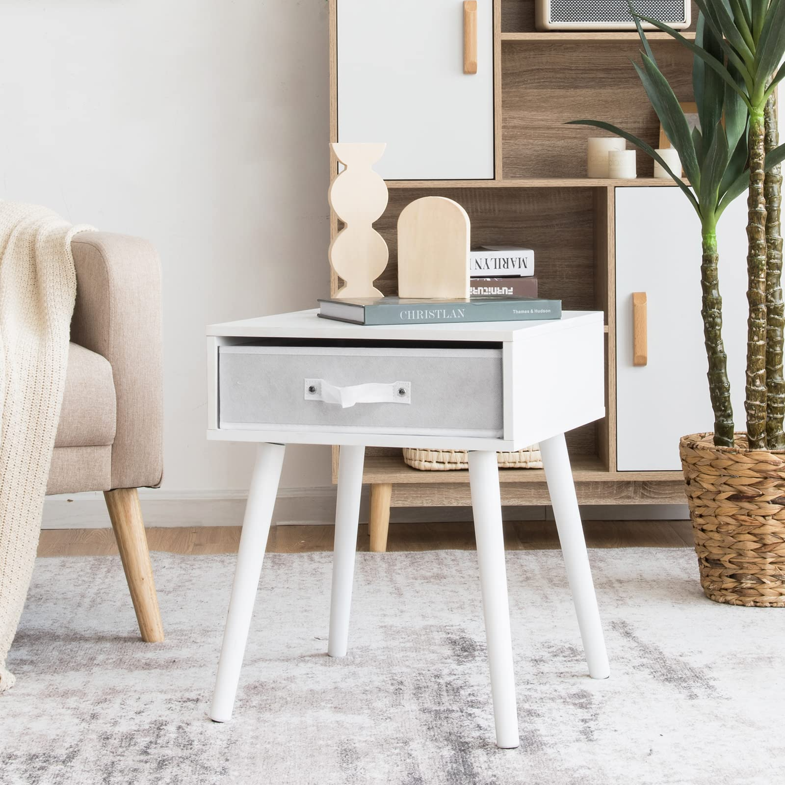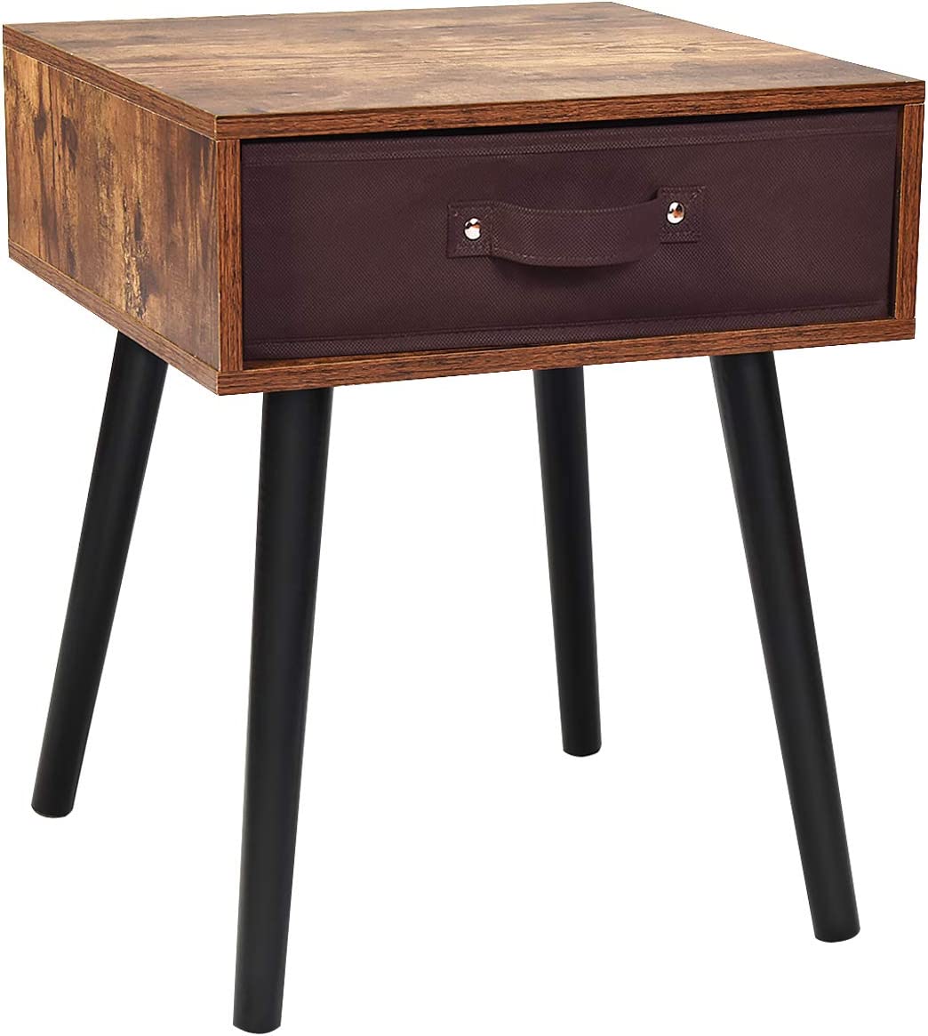 End Table Accent Bedside Table W/ 1 Removable Fabric Drawer and Solid Wooden Legs