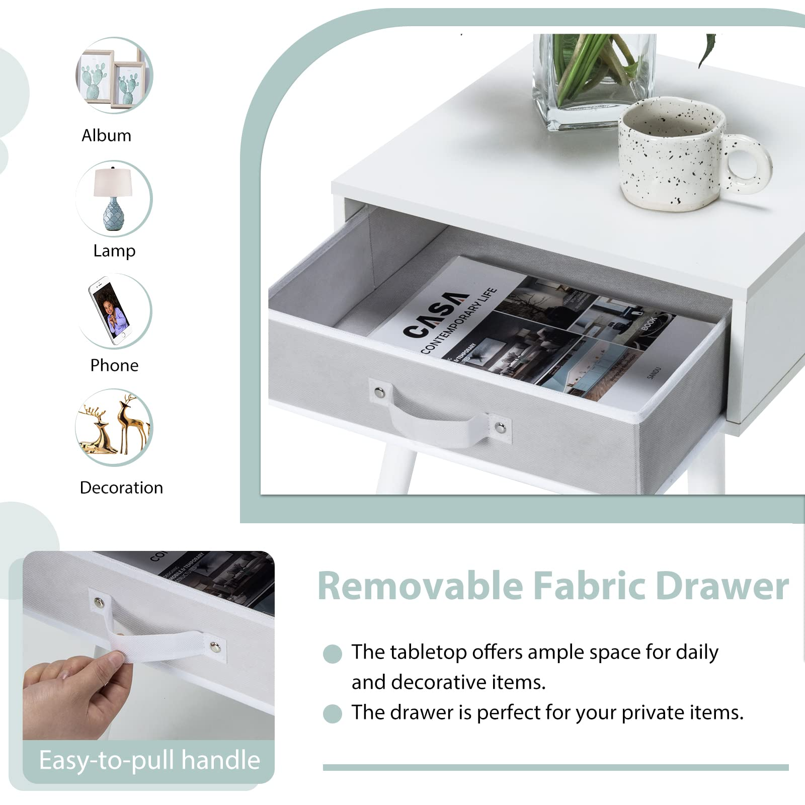 Removable Fabric Drawer: The bedside table features spacious storage drawer with handle to store your various small items, such as remote control, glasses, etc. The drawer made of fabric is lightweight and removable, so it can be used wherever you need. Besides, the nightstand has a wide tabletop, which can offer ample space to place your clock, lamp or book at hand.