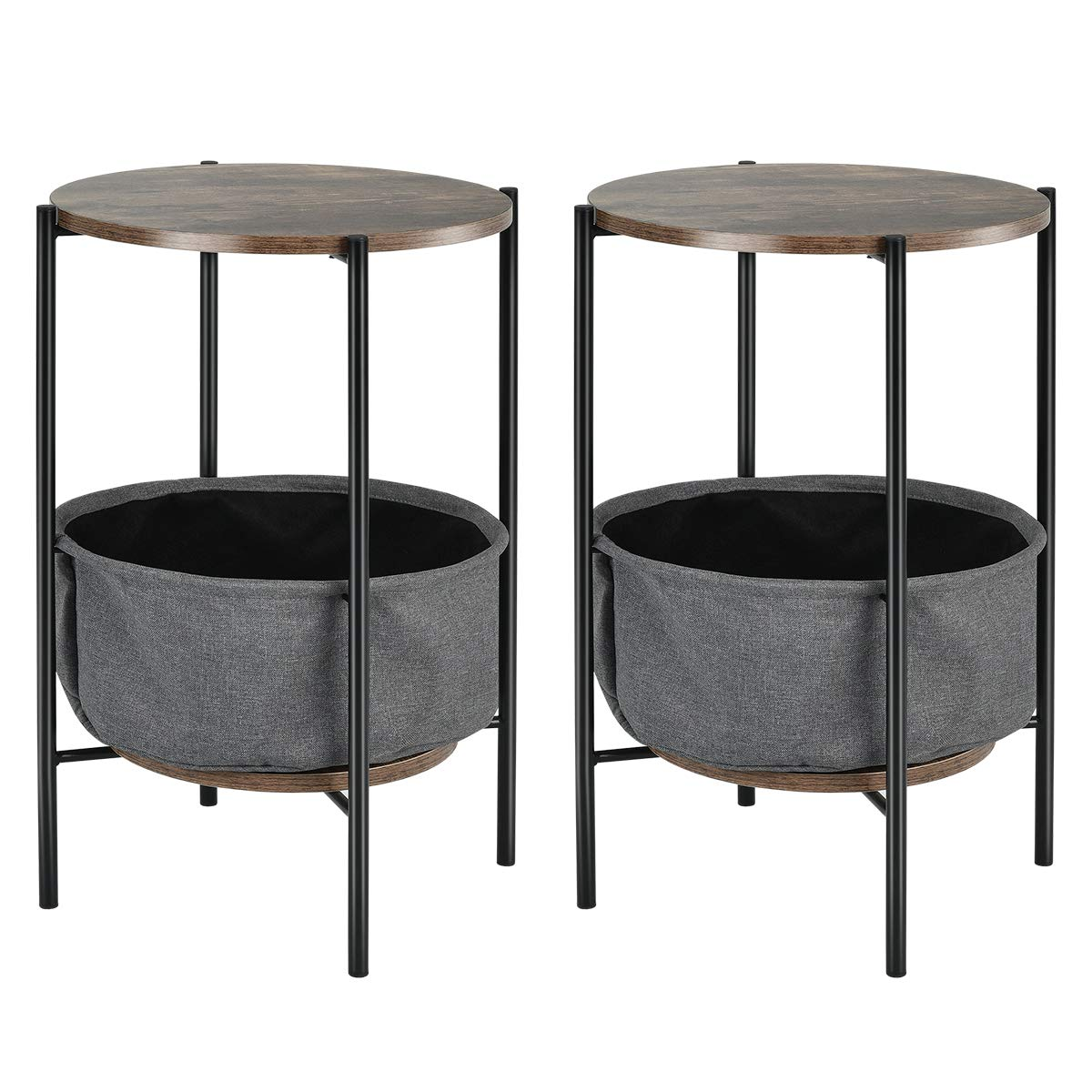 - Attentive Appearance: Featuring vintage engineered wood top, powder-coated steel legs and natural fabric basket, this contemporary round shaped side table with under-shelf combines the retro aesthetic and modern industry vibe that would blend well with almost any home decor style.