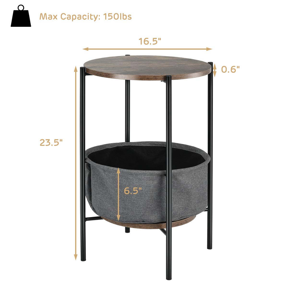 Sturdy Structure:Constructed of good quality metal as the frame for the sides table which ensure long lasting durability. Two layers of engineered wood top provide a modern feel, while one more board under fabric basket will prop up its shape and keep stable even with large amount of items.