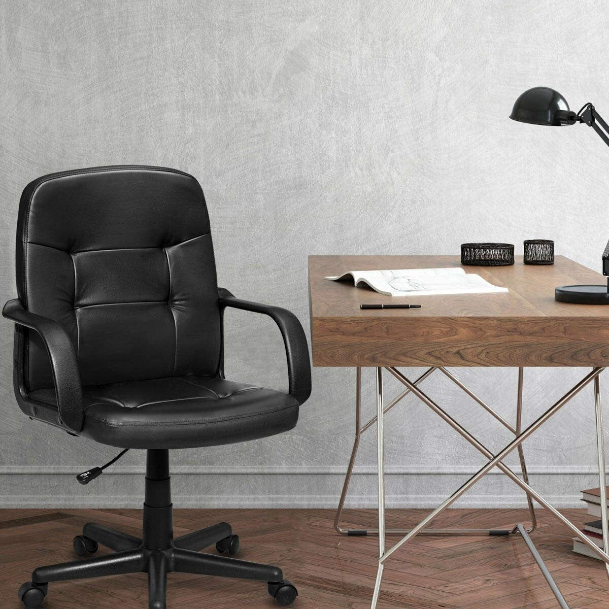 This is our brand new mid-back executive office chair which features sophisticated profile and exquisite workmanship to offer a modern and professional look for your home or office. The adjustable task chair helps promote a comfortable seated position by adjusting the seat height between 16"-19.5", while it offers a versatile range of motion with 360 degree seat and durable casters for multi-tasking convenience. While maintaining ergonomic design, the cushion and backrest of the high-density sponge further enhance seat comfort. Refresh your office space with this office chair, a versatile choice for computer desks and workstations. Don't hesitate to buy it!
