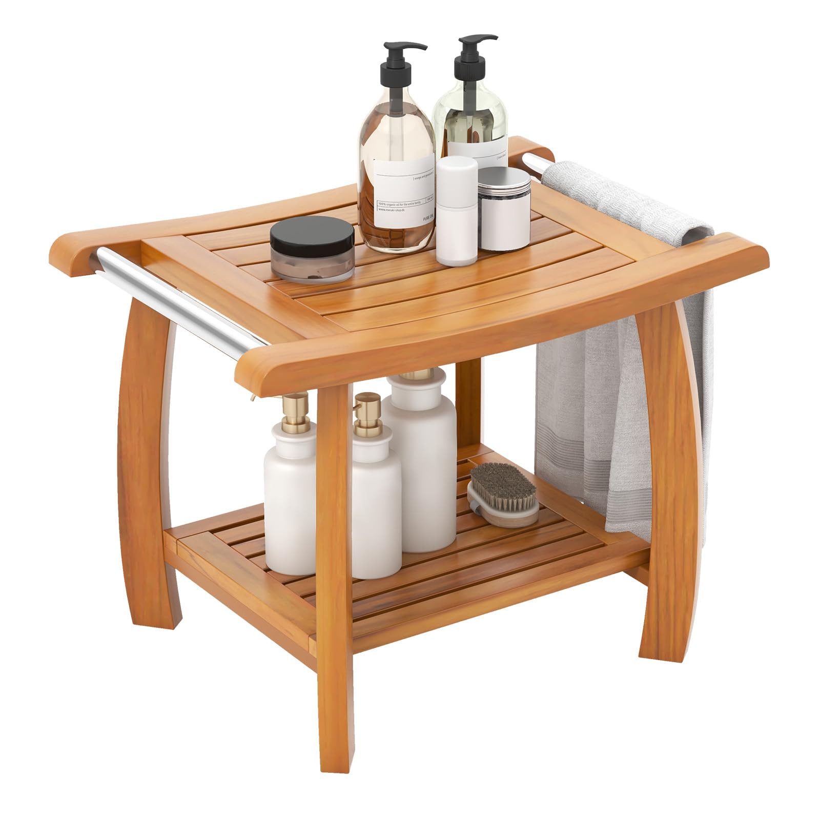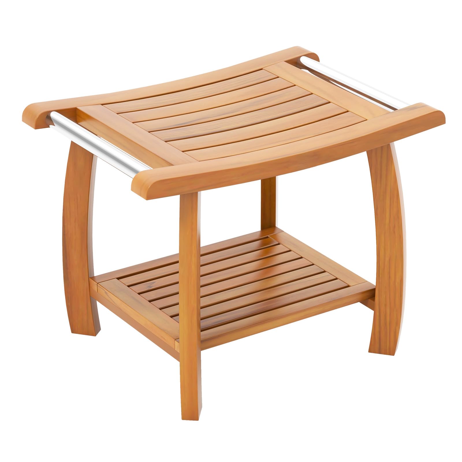 The shower stool features a high-quality teak wood frame and water based finish to ensure long-lasting use in your bathroom or shower room. The curved seat provides you with ergonomic support. The seat withstands a weight of 350 lbs. The curved legs help it stay steady on the ground. Additionally, the bottom shelf and stainless steel towel racks offer large storage space for your shower supplies. You can also use it as a side table in the living room, a changing shoe bench in the entryway, or a plant stand in the balcony.