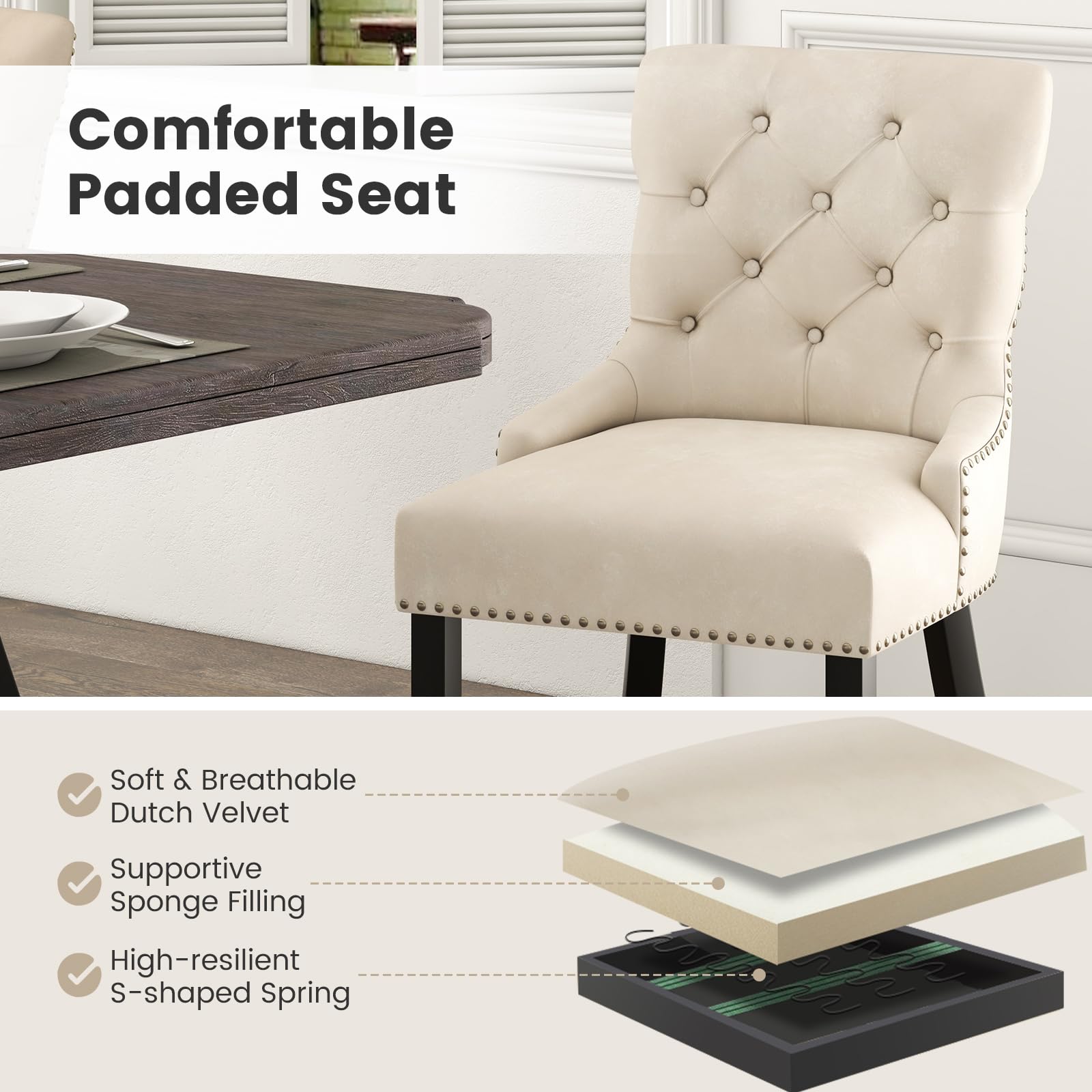 • Wide & Comfy Upholstered Seat: The 22" wide upholstered seat is covered with skin-friendly and soft dutch velvet, ensuring comfortable sitting experience. Additionally, the thickened cushion with sponge and supportive s-shaped spring will greatly reduce your fatigue for dong dining sessions.