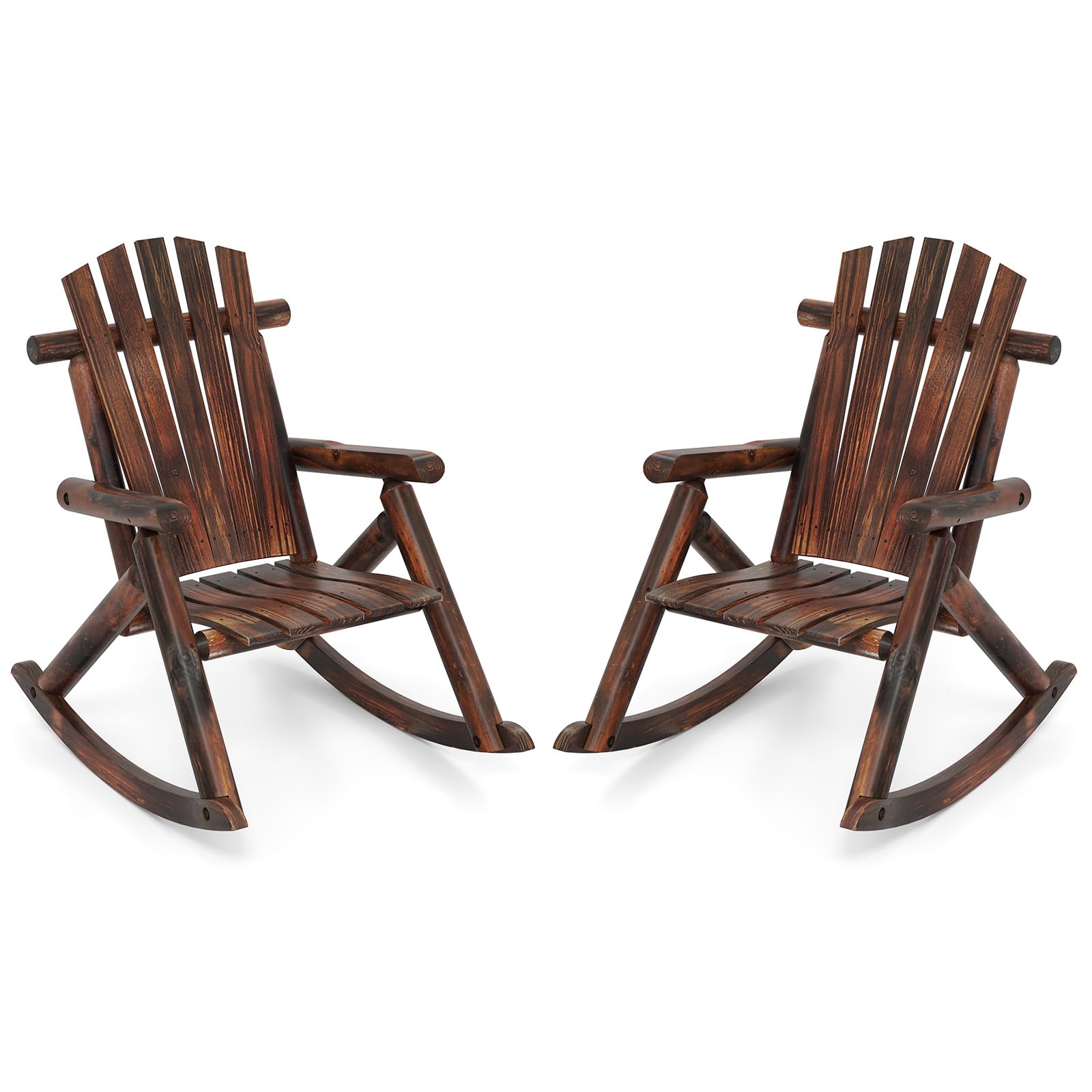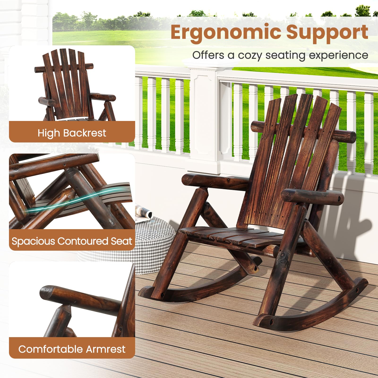 Its gentle rocking motion soothes the senses, making it the ideal spot to unwind. Built from premium fir and pine wood with high-temperature carbonization, the porch rocker ensures enhanced robustness and long-lasting durability. Designed to accommodate various body types, our rocking chair/bench can support up to 330 lbs, providing stability and peace of mind. The high backrest, contoured seat, and supportive armrests offer exceptional comfort, while the slatted design keeps you cool on warm days. Whether on your porch, patio, backyard, balcony, or garden, the Adirondack rocker adds a touch of rustic log-built charm to any outdoor space.