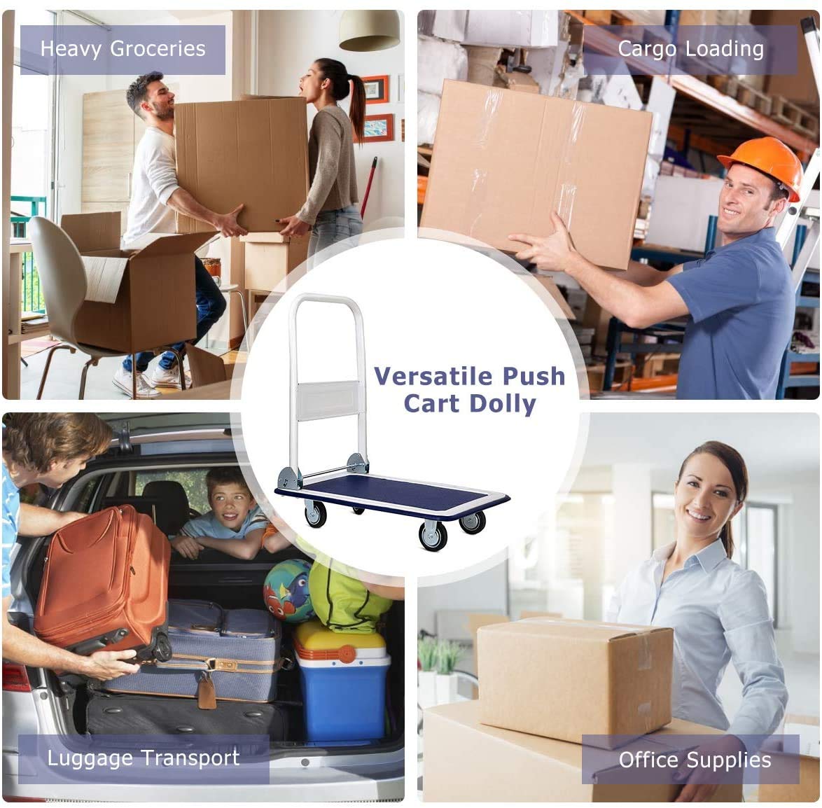 - Versatile Push Cart Dolly: The convenient dolly is lightweight and easy to pick up and put into the vehicle. It can be used to carry heavy groceries, recyclable bins, wood planks, luggage, equipment, cargo, etc., or for trade shows.