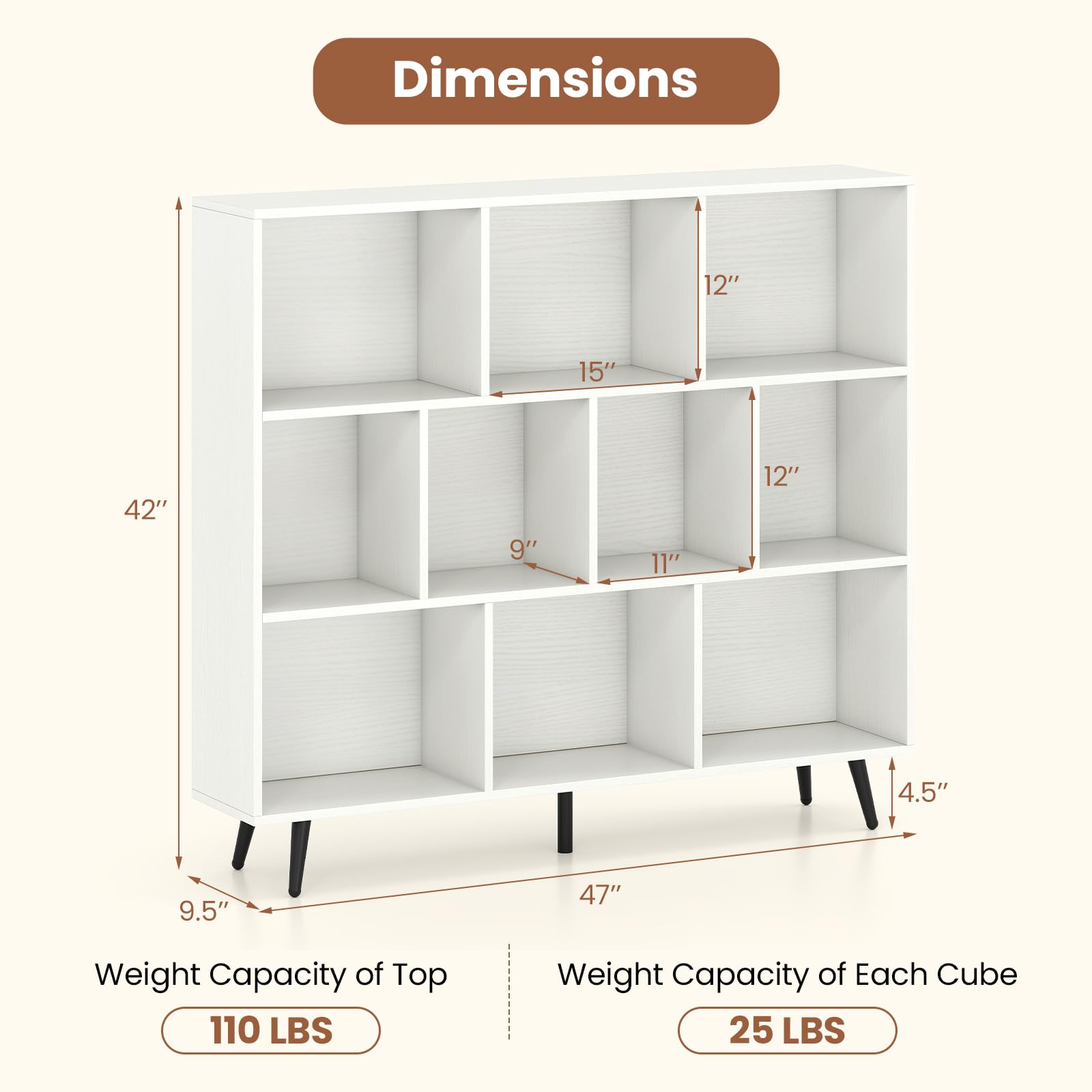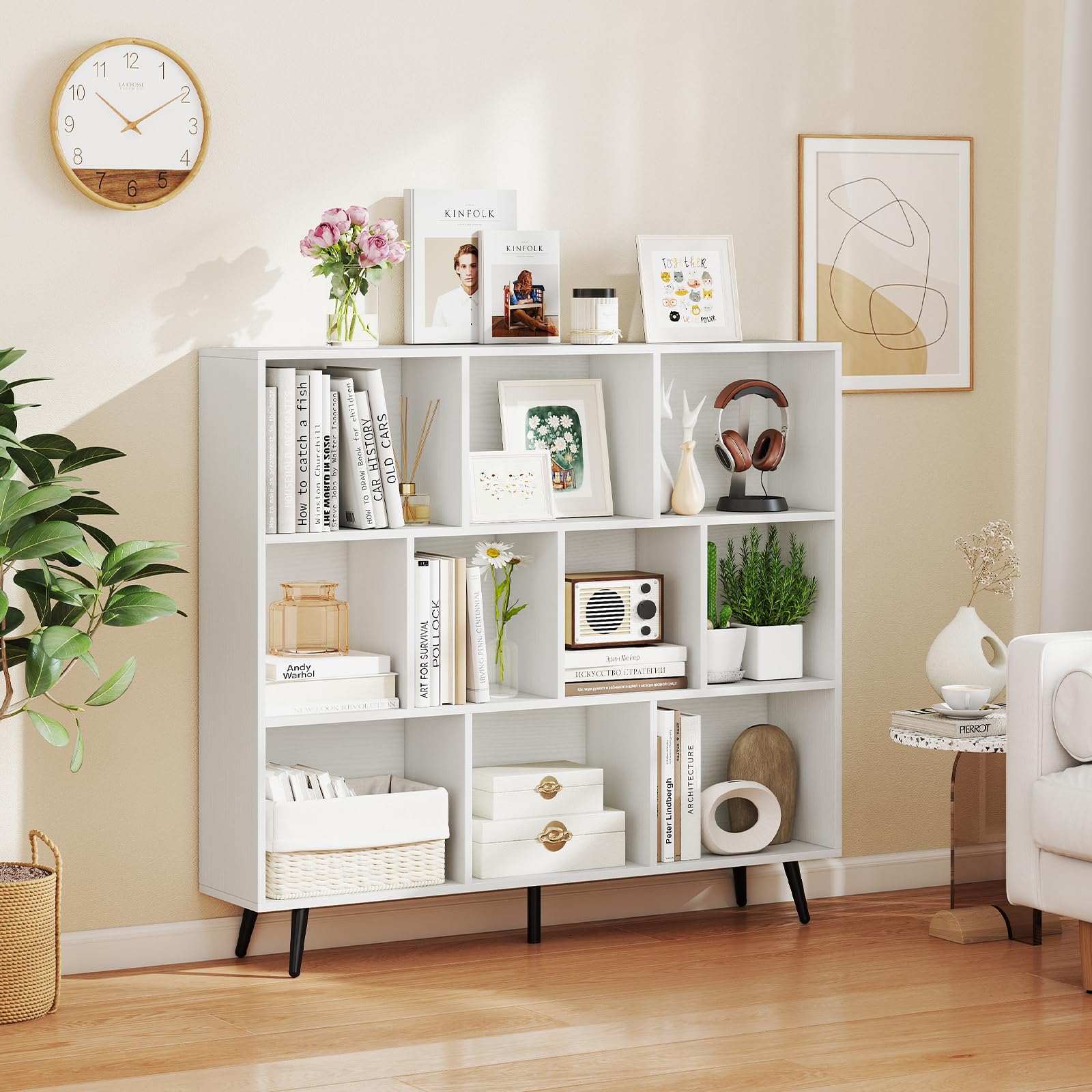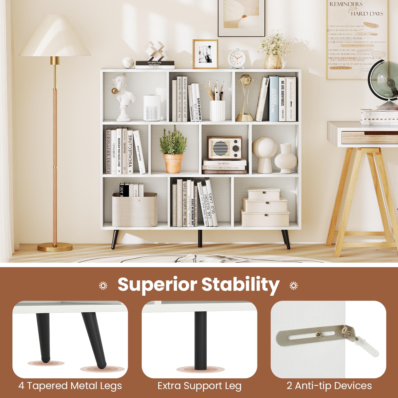 Discover the ultimate blend of functionality and style with the versatile bookshelf! Boasting a spacious top shelf complemented by 10 storage units, this piece is ideal for effortlessly organizing books, showcasing cherished photos, and displaying vibrant plants. Expertly crafted from robust materials and supported by sleek metal legs, it promises unmatched durability and a contemporary look. The thoughtful inclusion of non-slip foot pads and anti-tip devices enhances its stability, ensuring a safe setting for both home and office environments. Elevated for easy maintenance, it's perfectly compatible with robotic vacuums, making cleaning a hassle-free task. With its elegant white finish and timeless mid-century design, this bookshelf is not only a practical storage solution but also a stylish addition to any space. Elevate your decor while keeping your essentials neatly organized!