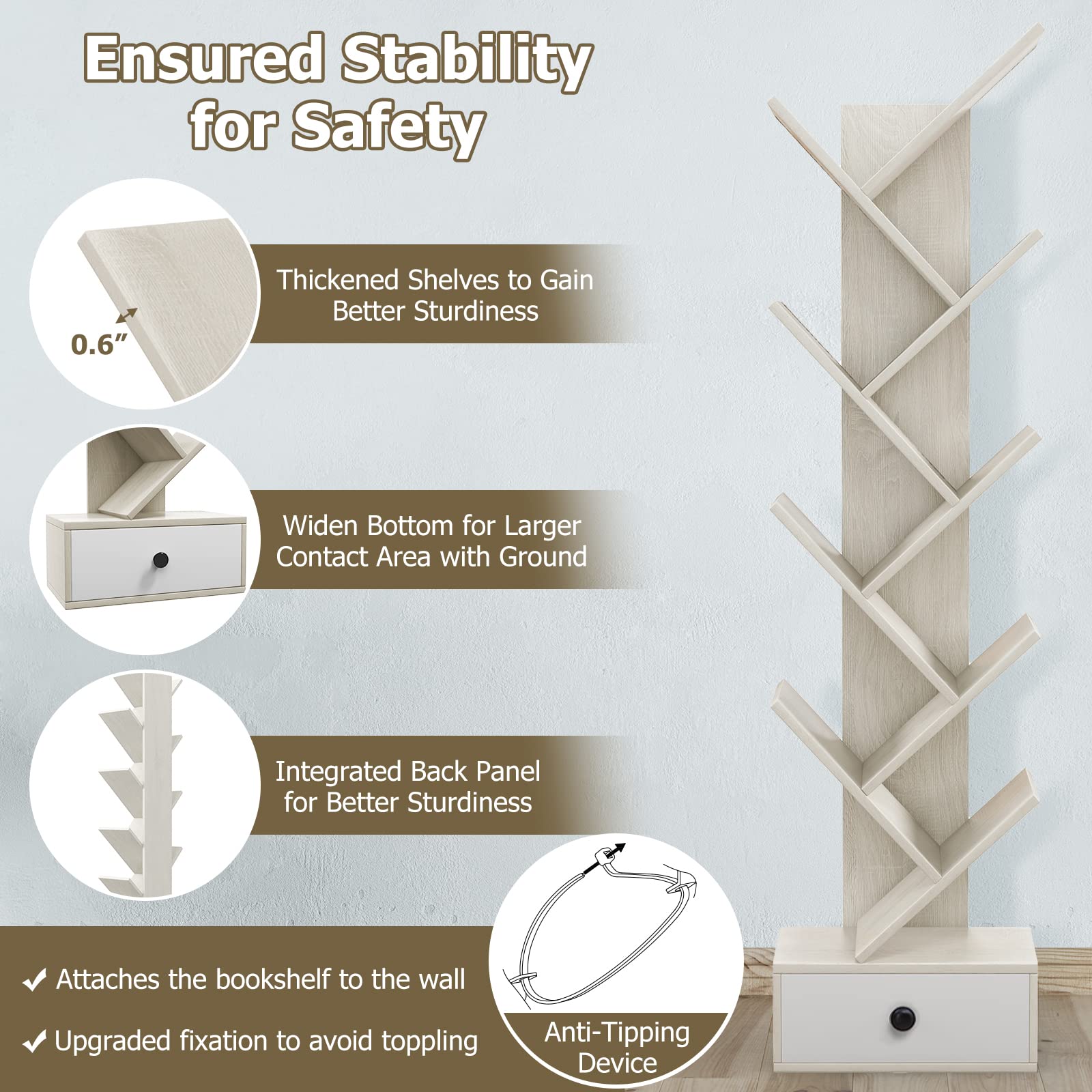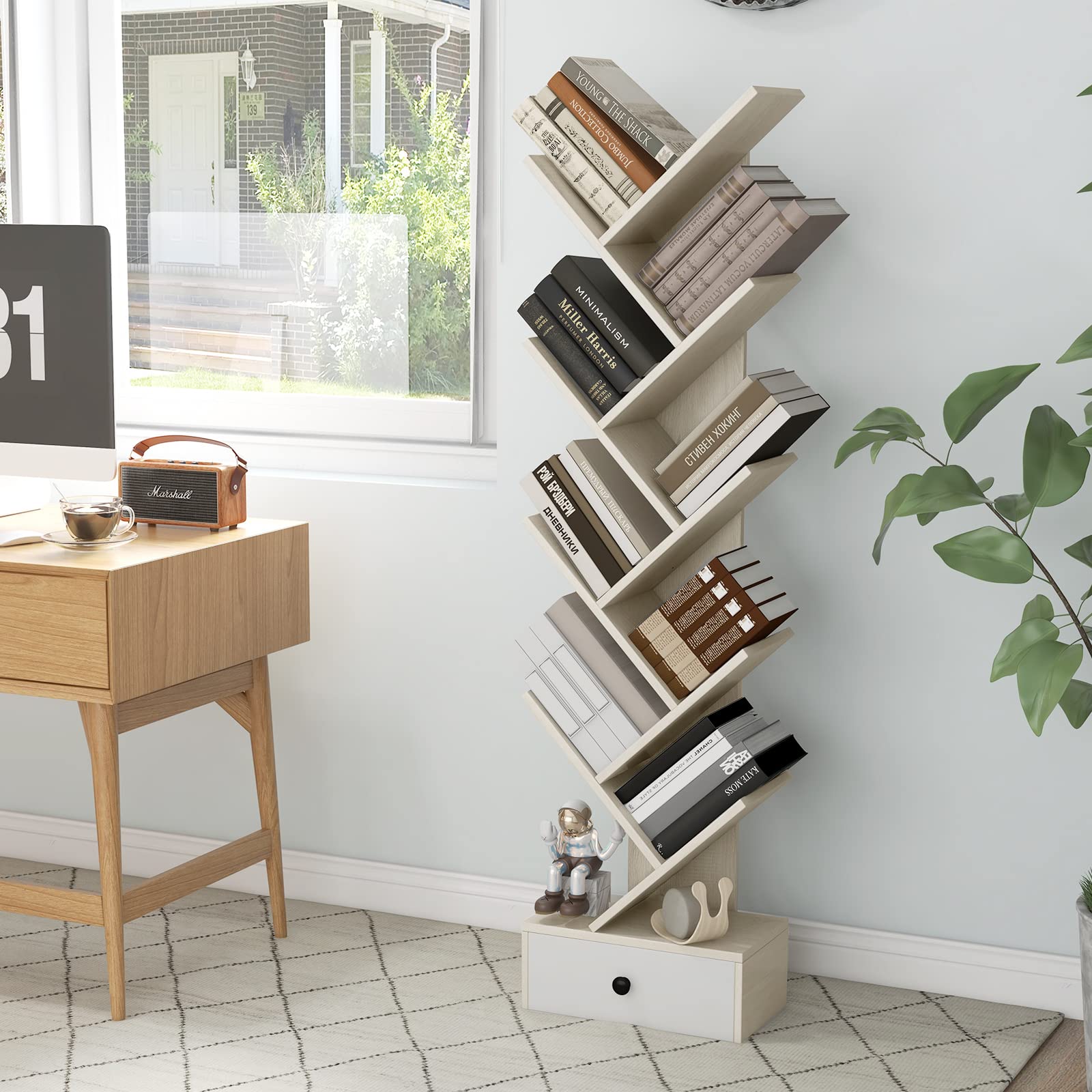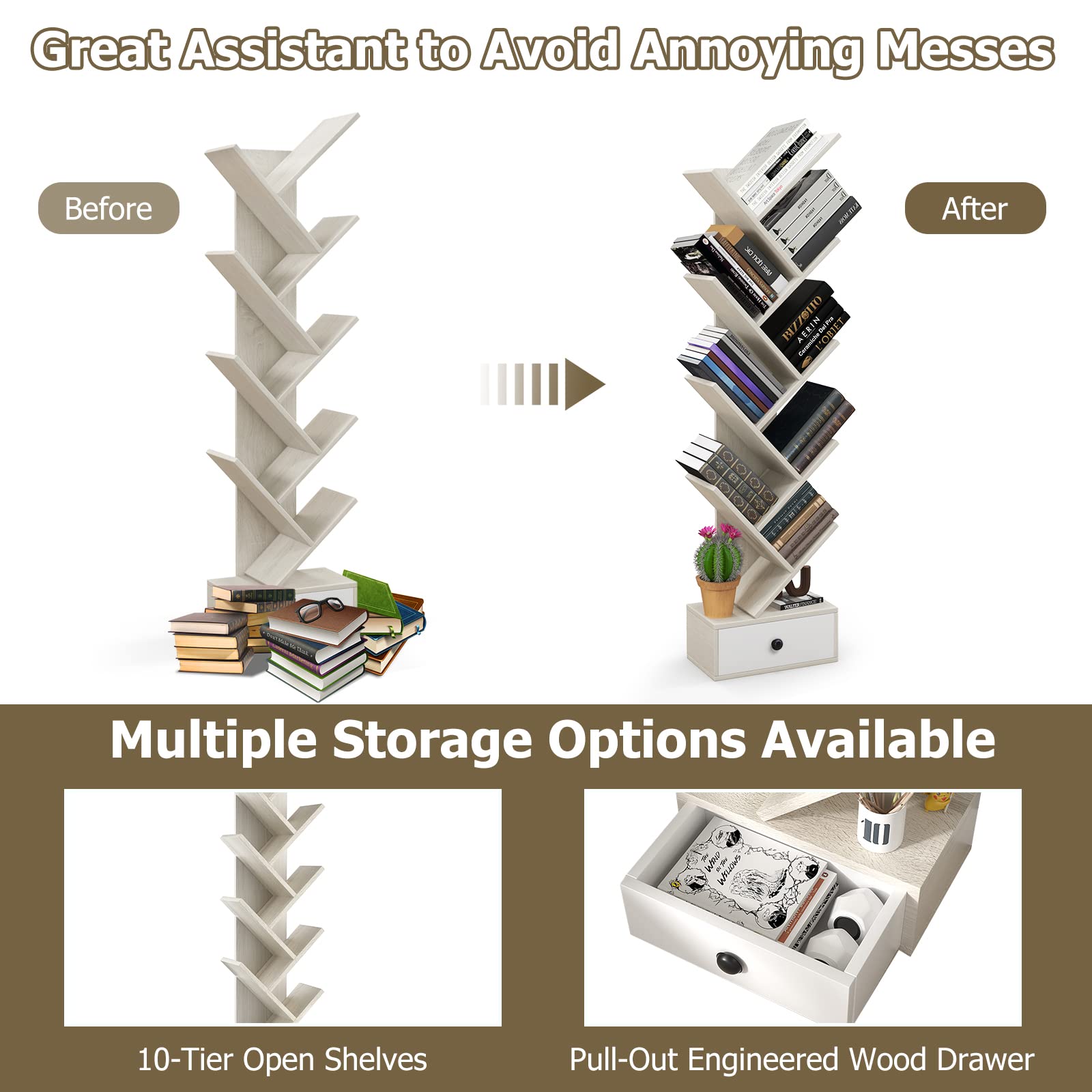 - 10-Tier Bookshelf with Drawer: Giantex tree bookcase is designed with 10 wide shelves in total, you can stack books based on different classification rules on each shelf. More, there is a pull-out wooden drawer at the bottom, allowing you to gain privacy for keys.