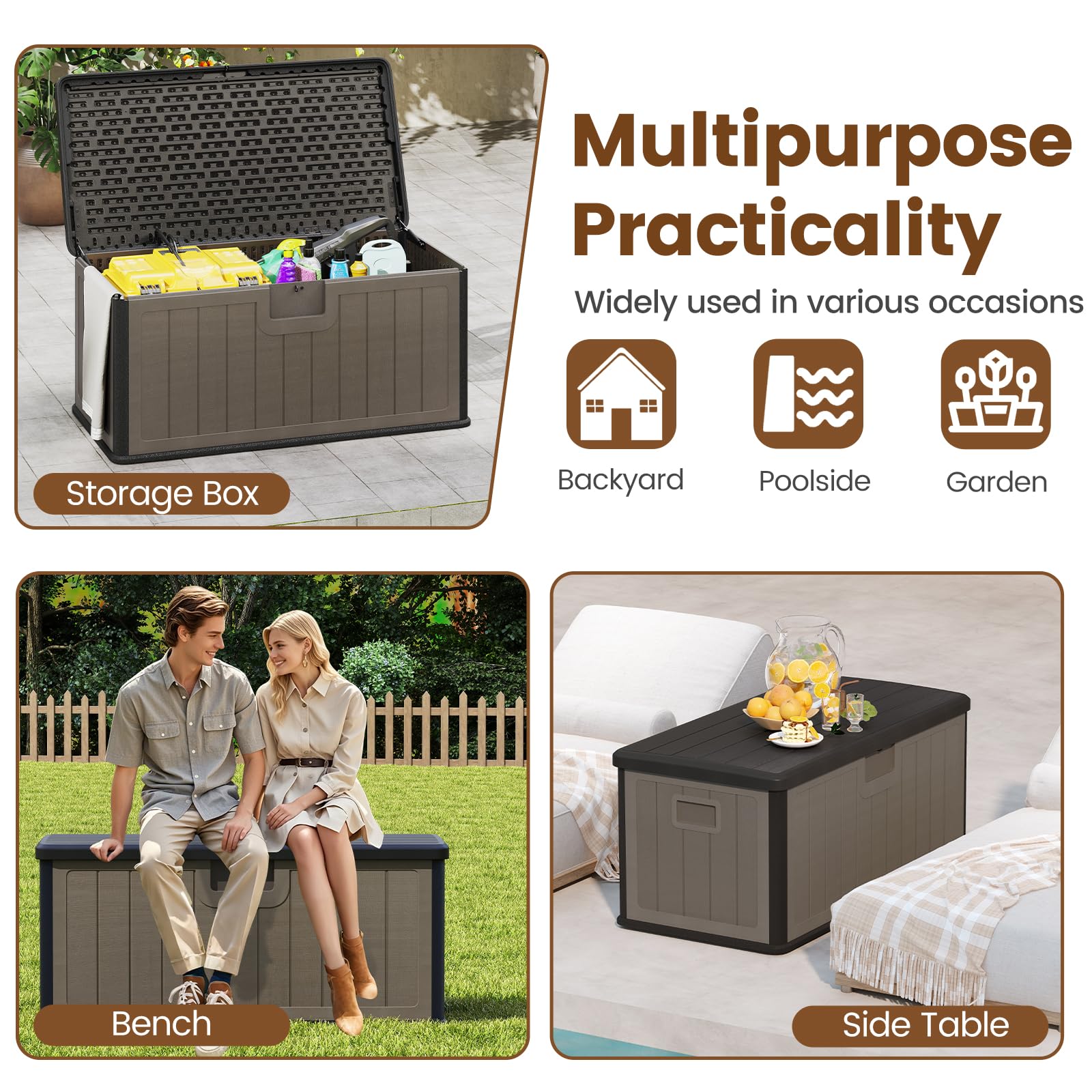 Streamline your outdoor space with our versatile 100-gallon resin deck box. This all-weather storage solution is perfect for organizing patio cushions, pool supplies, gardening tools, and sports equipment, maximizing your space and minimizing clutter. Built to last, our deck box is constructed from waterproof and sun-resistant HDPE material, featuring a honeycomb design for added impact resistance and aluminum alloy corner braces for durability. It can even function as a bench or side table, supporting up to 440 lbs. Effortless access is key with reliable gas struts for smooth opening and closing, while a lock hole design allows for added security with a padlock (not included). Besides, built-in side handles make transportation a breeze. Say goodbye to mess and hello to style with our practical and sturdy resin storage box.