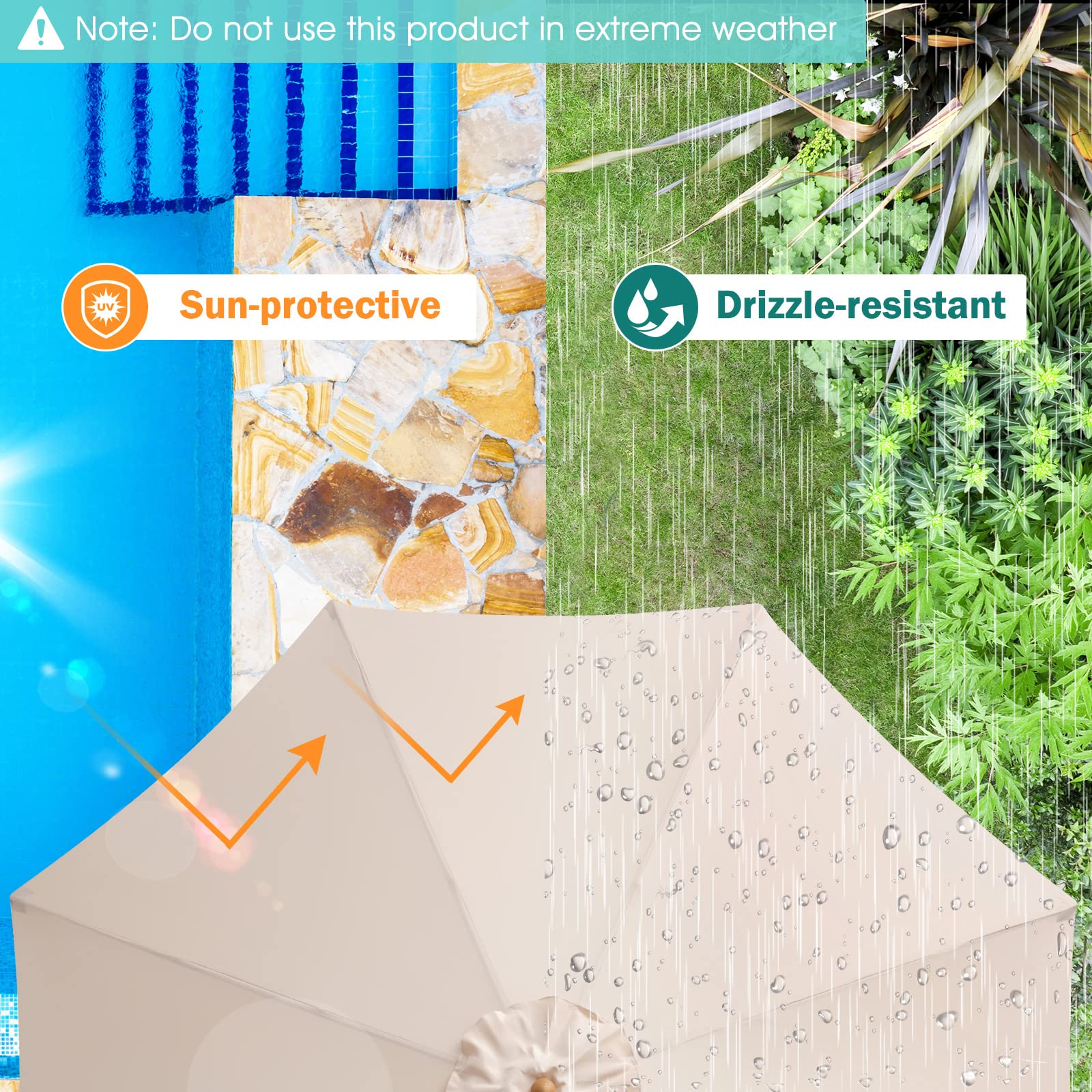 • Cooler Sunshade: The canopy is made of high-quality 180g polyester fabric, which is sun-protective to effectively block sunlight, endowing a cooler space for better relaxation. Meanwhile, it is drizzle-resistant as well. And the top vent promotes air circulation for heat dissipation. (NOTE: DO NOT USE THIS UMBRELLA IN EXTREME WEATHER).