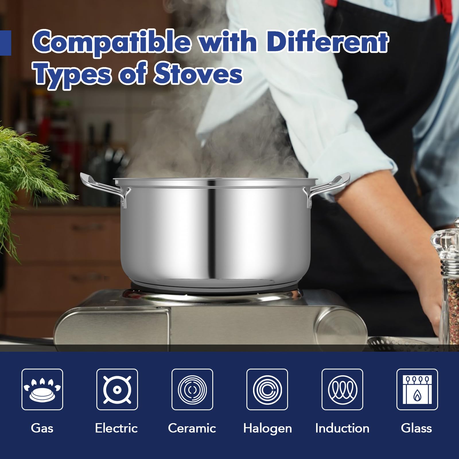 - [Wide Compatibility]: This 12 piece stainless steel pots and pans set is compatible with various types of stovetops, including gas, electric, ceramic, halogen, induction, glass. The flexibility allows you to use your favorite pieces on a variety of cooking surfaces with maximum efficiency and convenience.