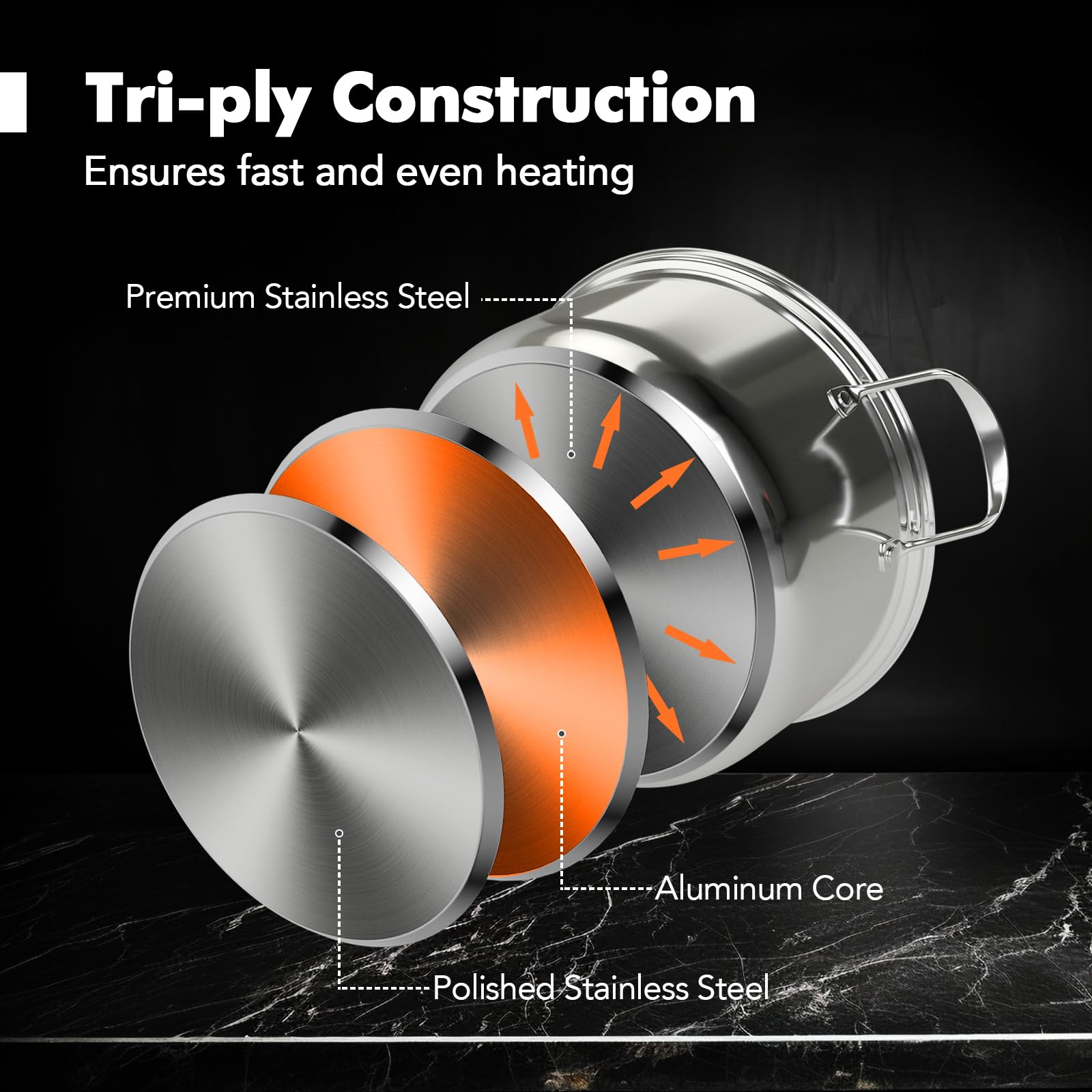 - [Tri-Ply Stainless Steel]: Featuring a tri-ply construction, the kitchen cookware sets are made with premium stainless steel, aluminum core, and polished stainless steel. This design ensures quick, even heating without hot spots, perfect for making your meals more delicious and nutritious.