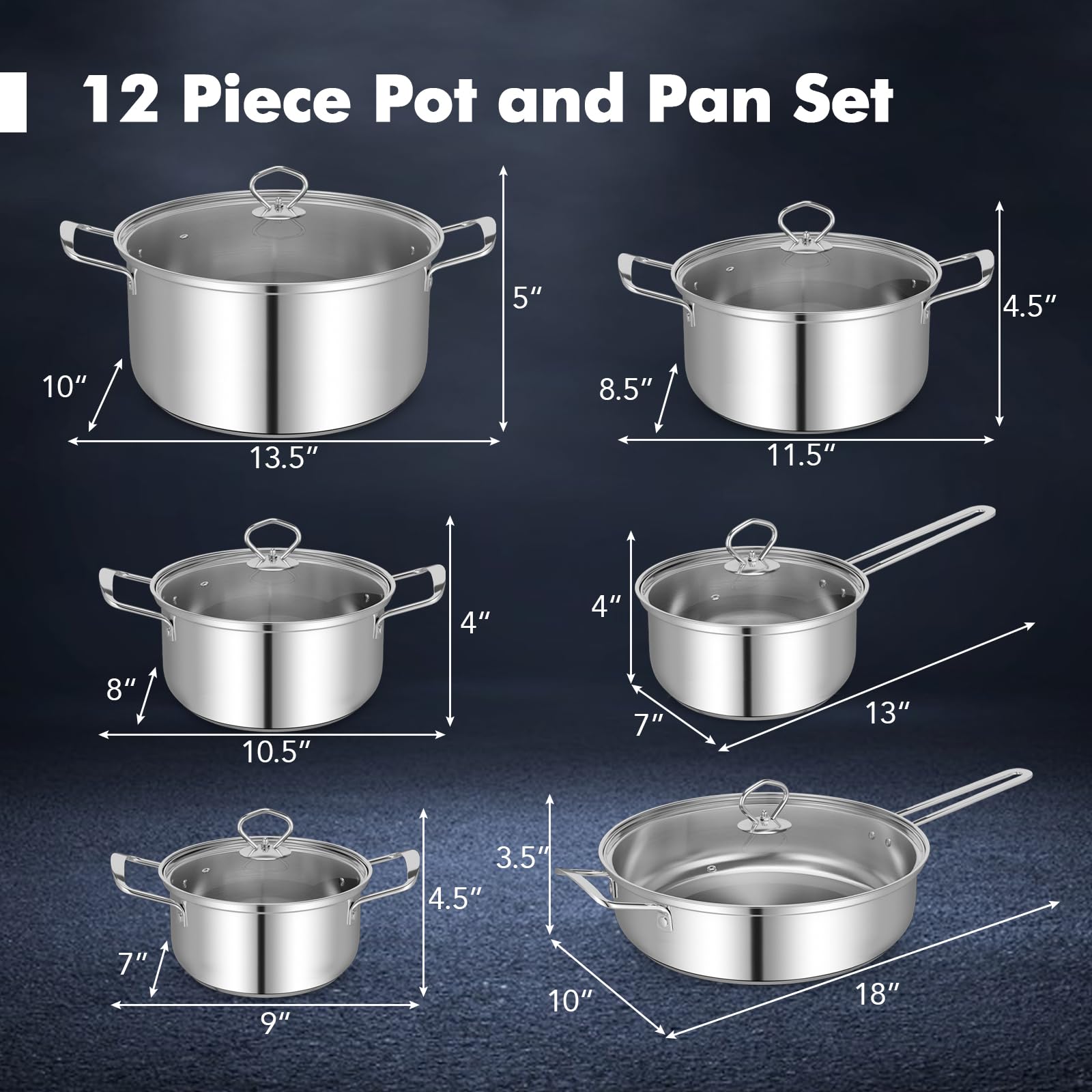 - [12 Piece Pot and Pan Set]: This stainless steel cookware set includes a 7 QT stockpot, a 4.5 QT stockpot, a 4 QT stockpot, a 3 QT stockpot, a 10” frying pan, a 2.5 QT sauce pan, and 6 lids. Whether you are simmering, frying, or stewing, the kitchen cooking set meets your varying needs.