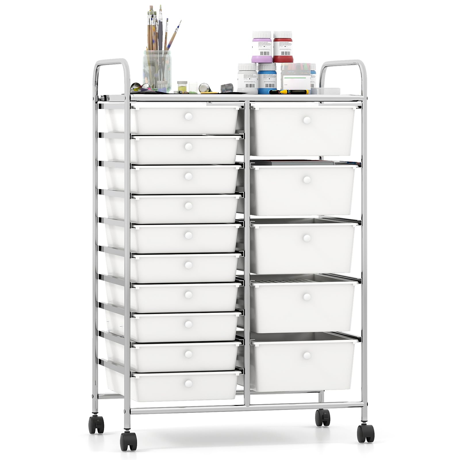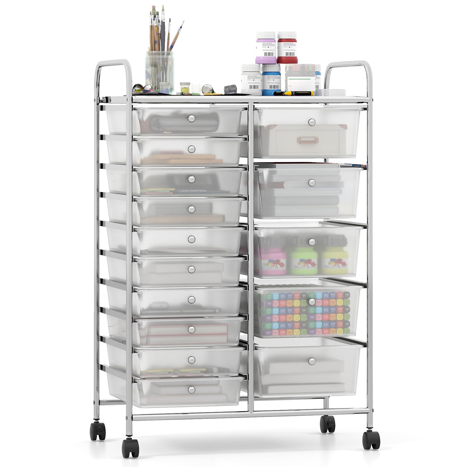 Supported by a chrome-plated metal frame, this mobile craft organizer is built for everyday use with its sturdy construction. The top shelf and smooth-gliding drawers provide easy access and flexible storage options. Equipped with 360° swivel wheels, including 2 locking casters to keep it secure when needed, the rolling utility cart organizer effortlessly moves between rooms. Whether you are organizing craft materials, office essentials, cosmetics, or tools, this plastic organizer trolley adapts to your requirements, making it ideal for craft rooms, studios, classrooms, etc.