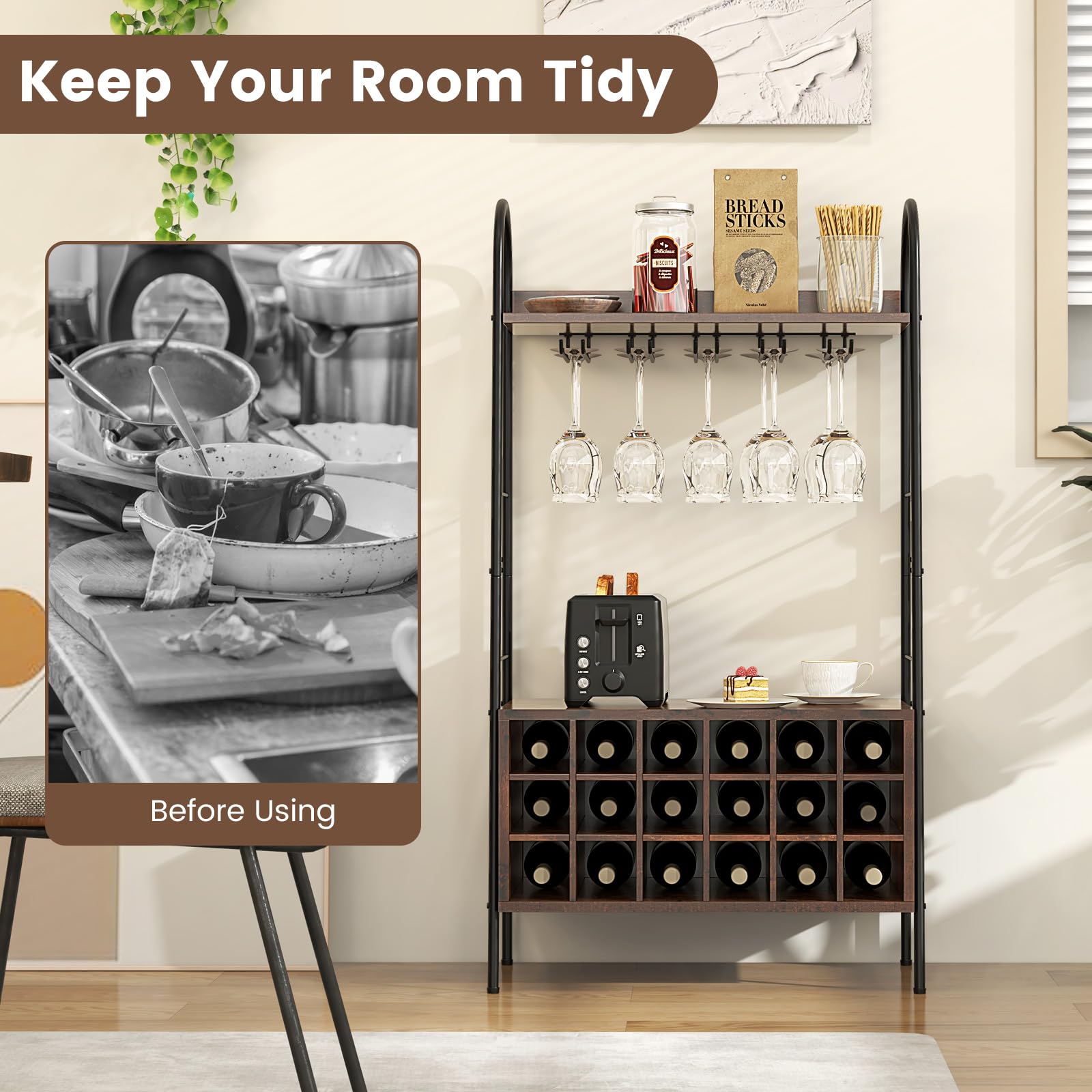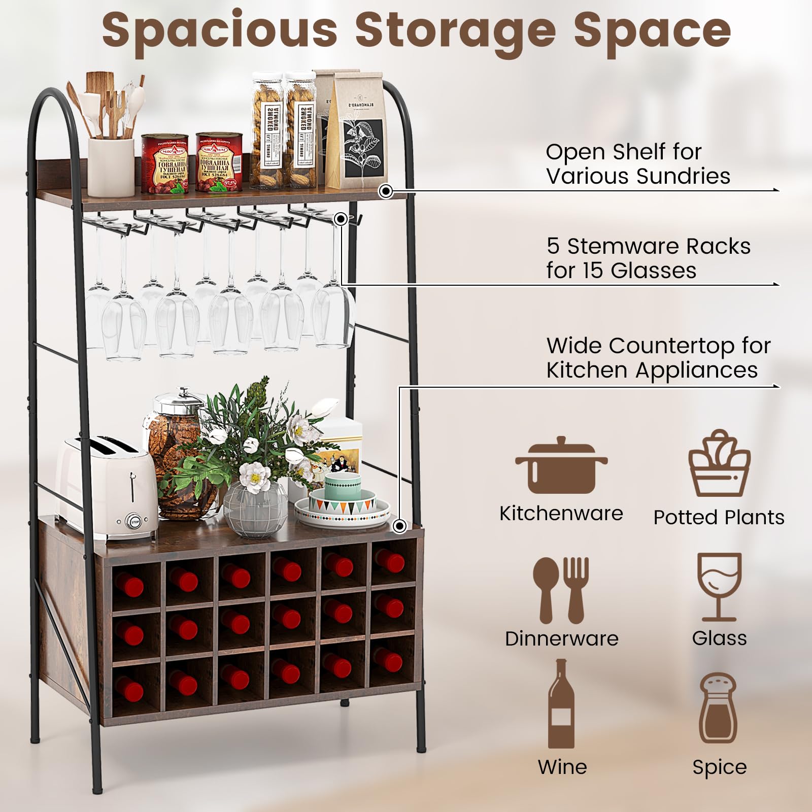 - [Classified & Abundant Storage]: We also design it with 5 stemware racks for 15 glasses, an open shelf for various sundries and a wide countertop for kitchen appliances. Thus, you can conveniently store a variety of stuff and easily reach for what you need.