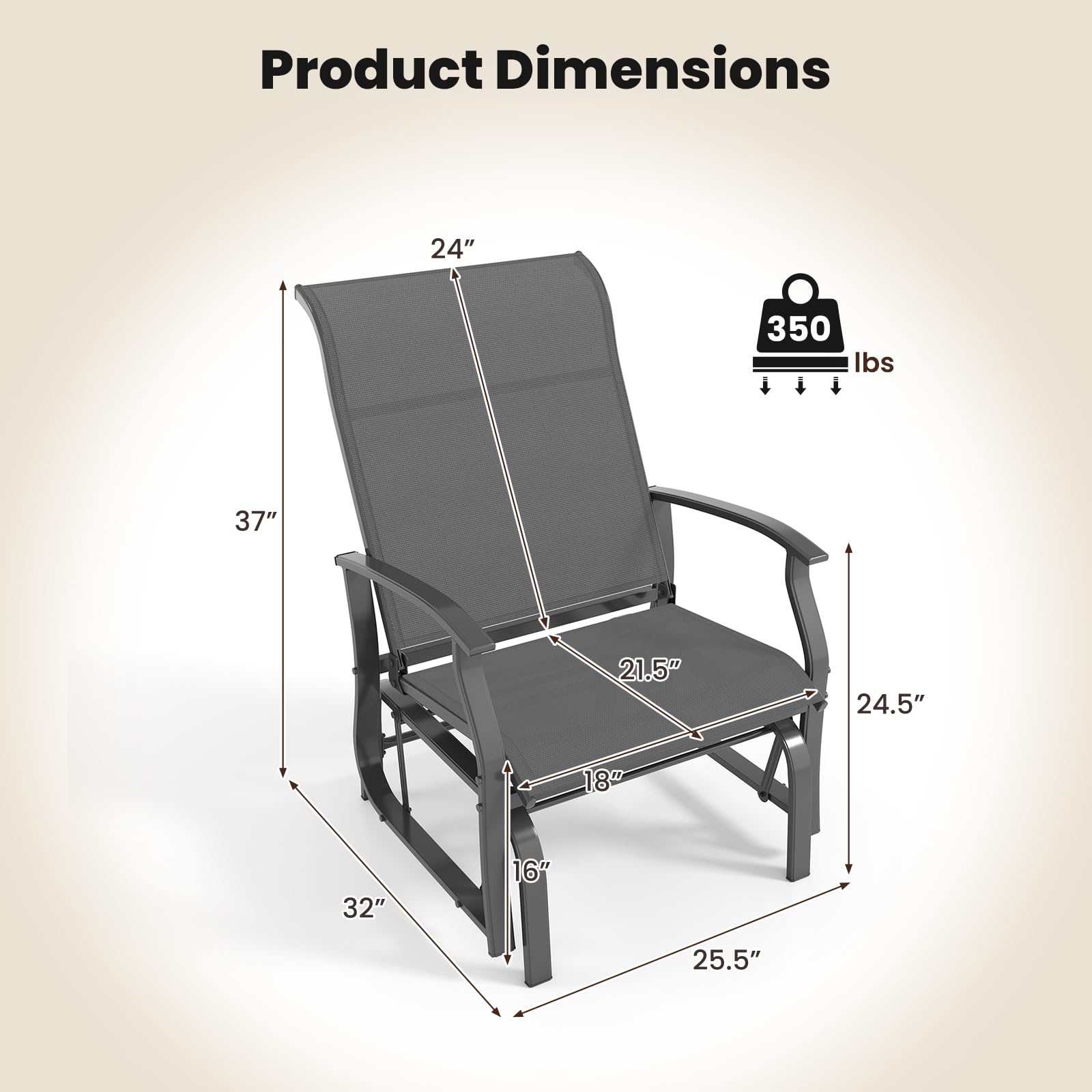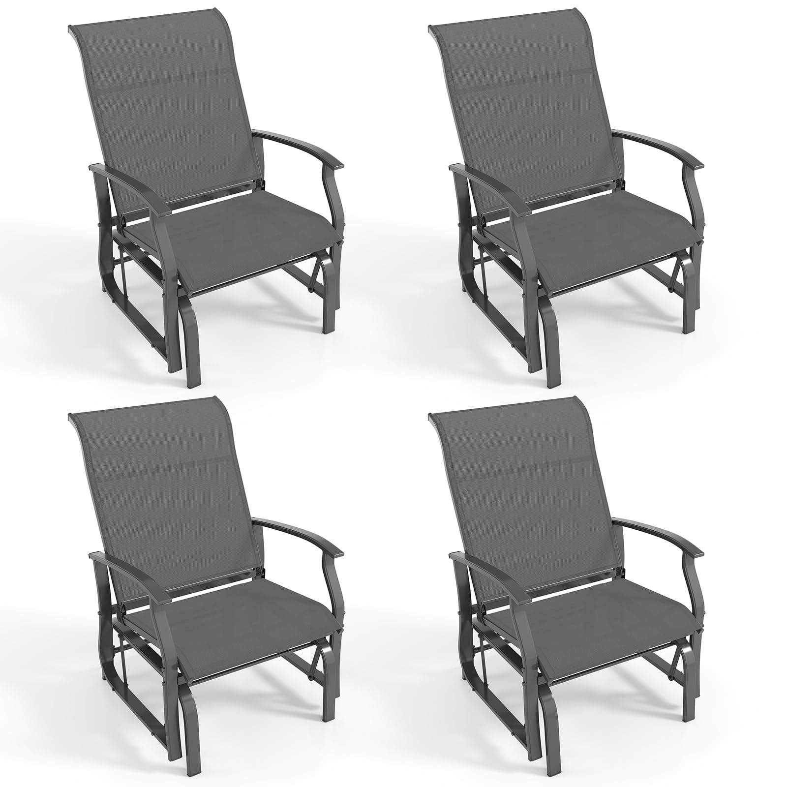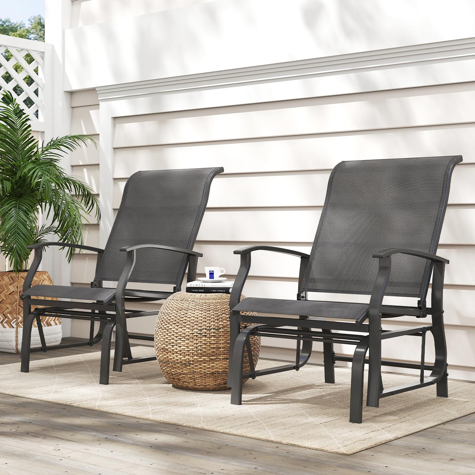 The ergonomic backrest and seat conform to your body's natural posture. With glider bearing arm brackets, you can swing to experience ultimate comfort. The breathable seat fabric makes you feel cool. Additionally, the selected metal frame allows for optimal stability. Featuring stylish look and clean lines, these rockers add a touch of sophistication to your outdoor space. They are suitable for poolsides, backyards, porches, and more. To prolong lifespan, please avoid leaving the chairs outdoors during rainy days.