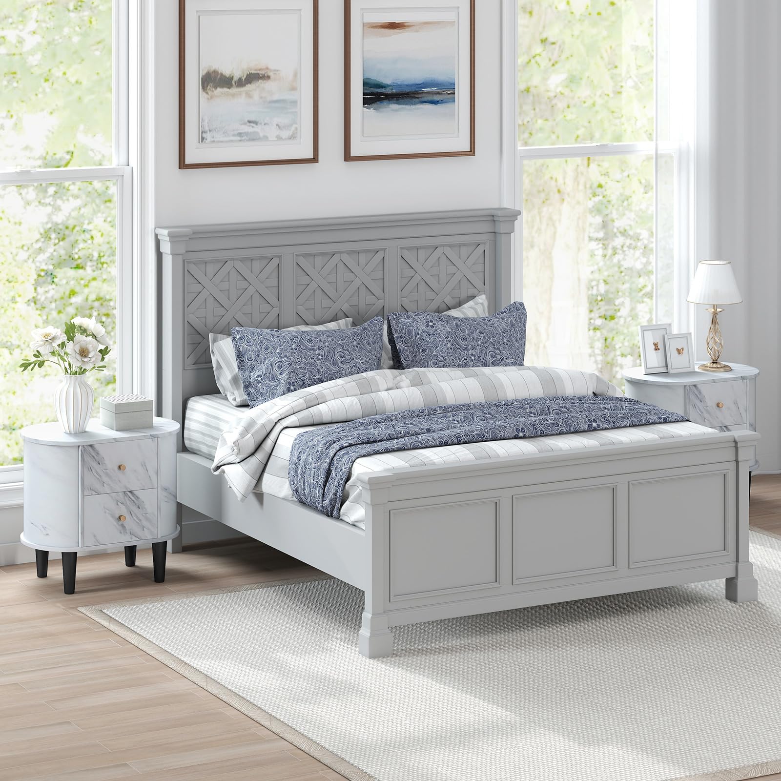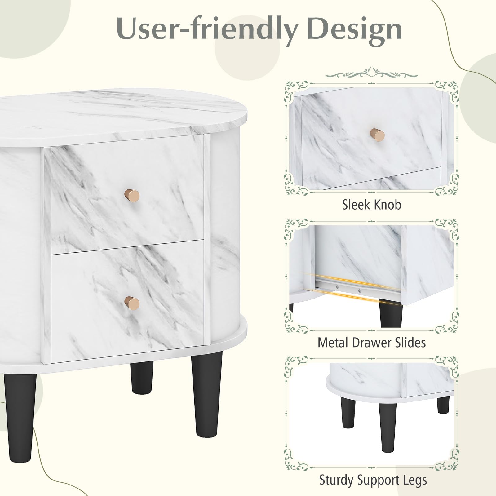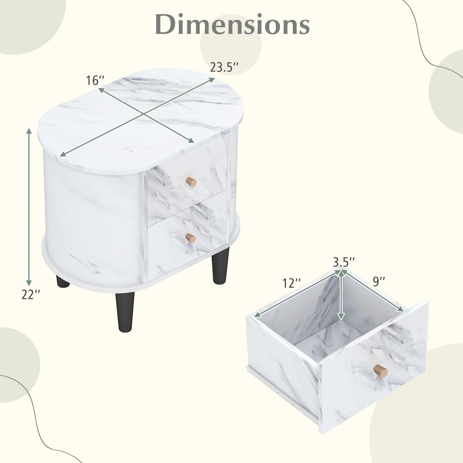 To enhance storage convenience, the nightstand features 2 large drawers to keep your essentials organized. The white faux marble top adds a touch of sophistication and is ideally sized to hold a lamp, a stack of books, or a refreshing beverage. Crafted for longevity, the floor night table boasts a robust wooden build that withstands daily use. This multi-functional piece serves as as a bedside table, sofa side table, or end table in your living room and bedroom.
